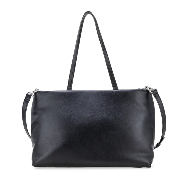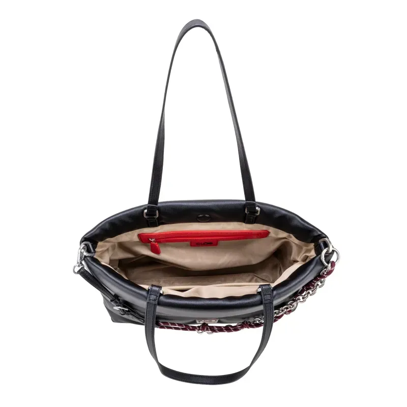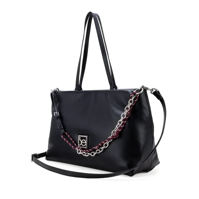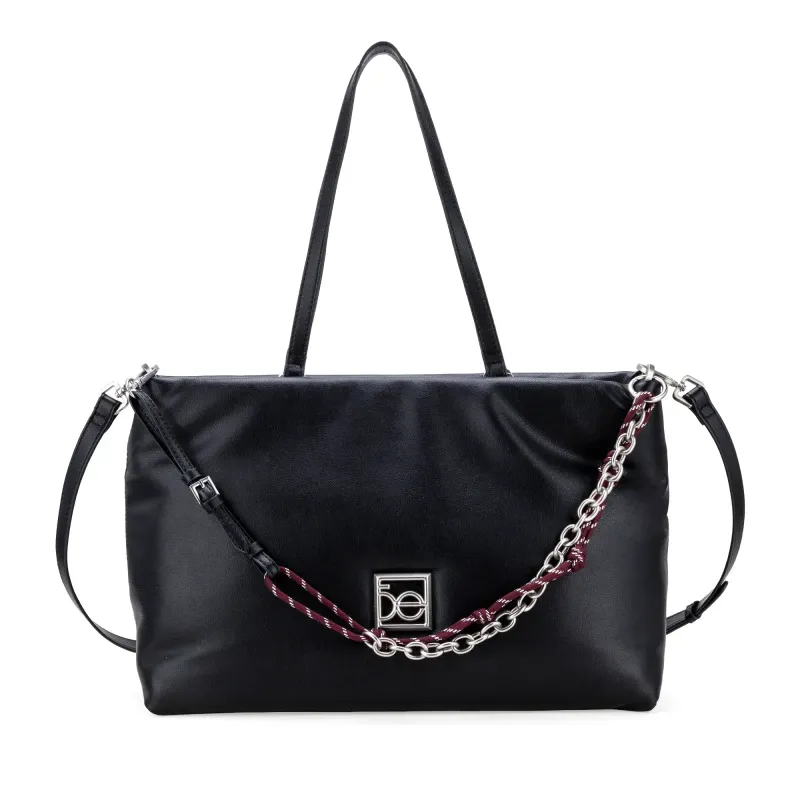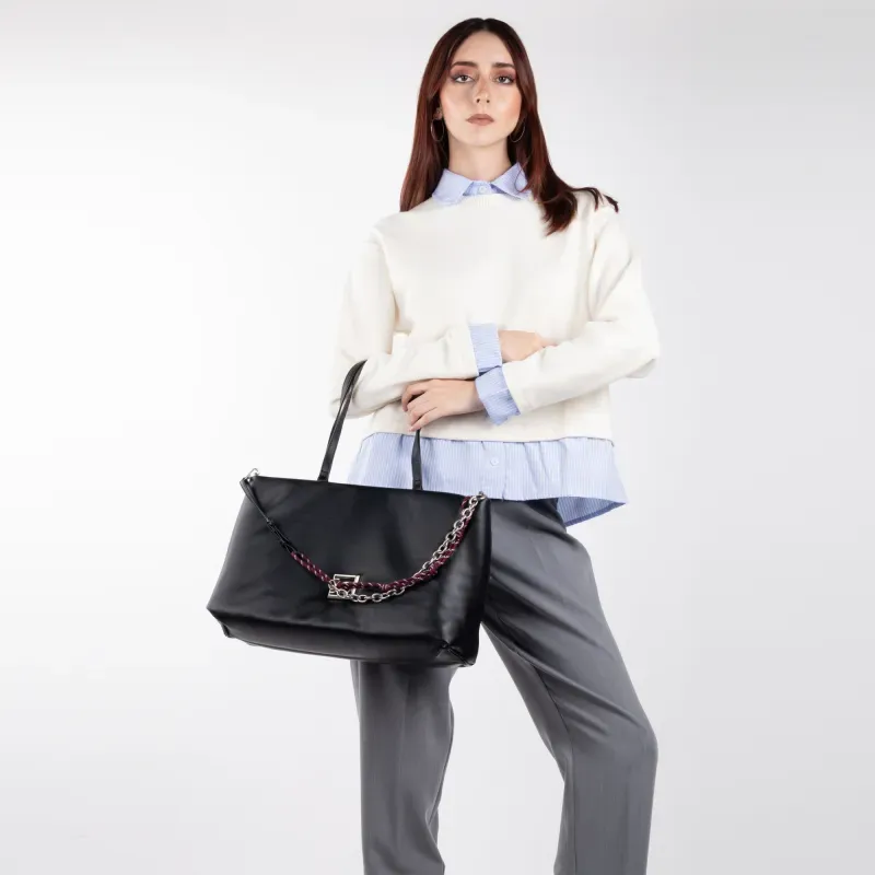 Bolso Tote hecho con material vegano. Cuenta con asa larga ajustable. Asa larga de cadena desprendible. Asa corta. Cuenta con herraje metálico de monograma.