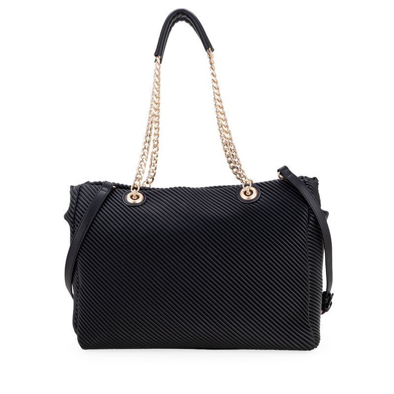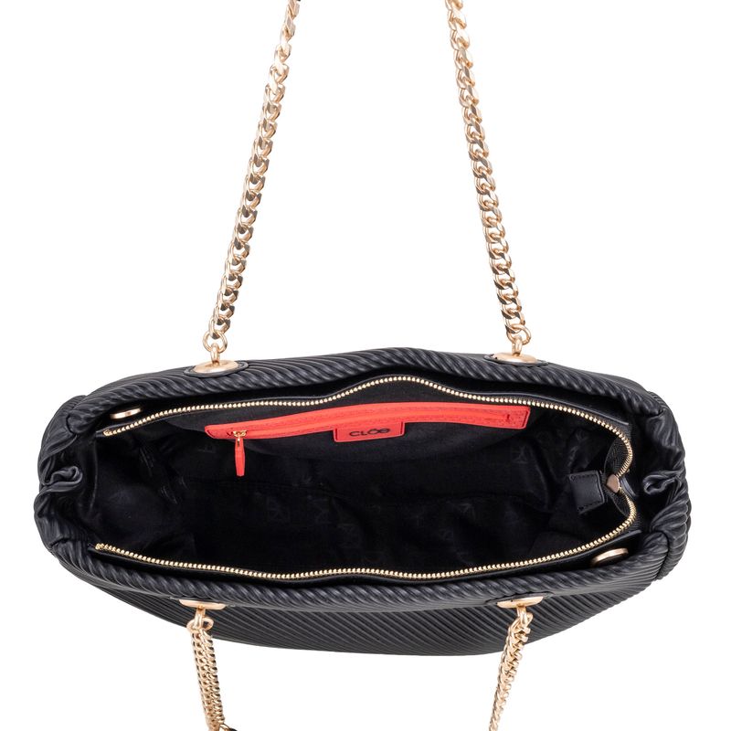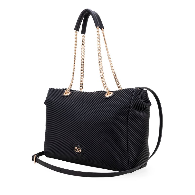 Bolso Tote hecho con material vegano apariencia piel. Cuenta con cierre metálico de larga duración. Tiene herraje metálico de monograma. Asa al hombro de cadena y asa larga adicional, ajustable y removible.