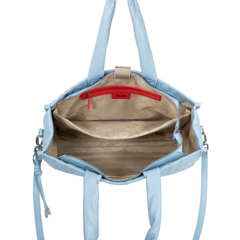 Bolso Tote hecho con material vegano apariencia piel. Cuenta con cierre metálico de larga duración. Diseño de monogramas bordados. Asa de hombro acolchada. Charm decorativo desprendible. Asa larga ajustable y removible.