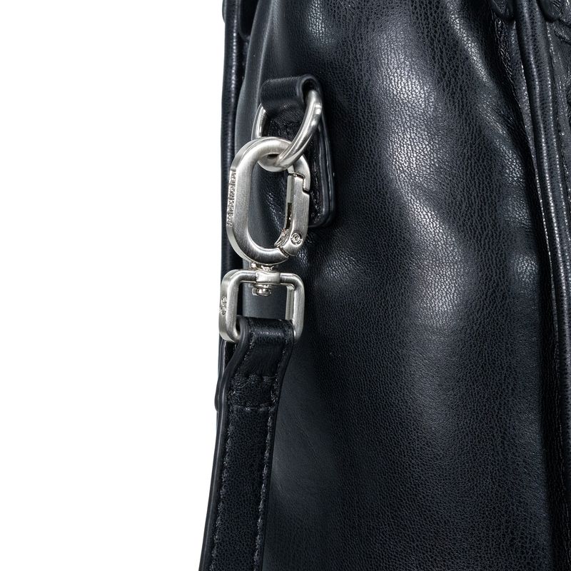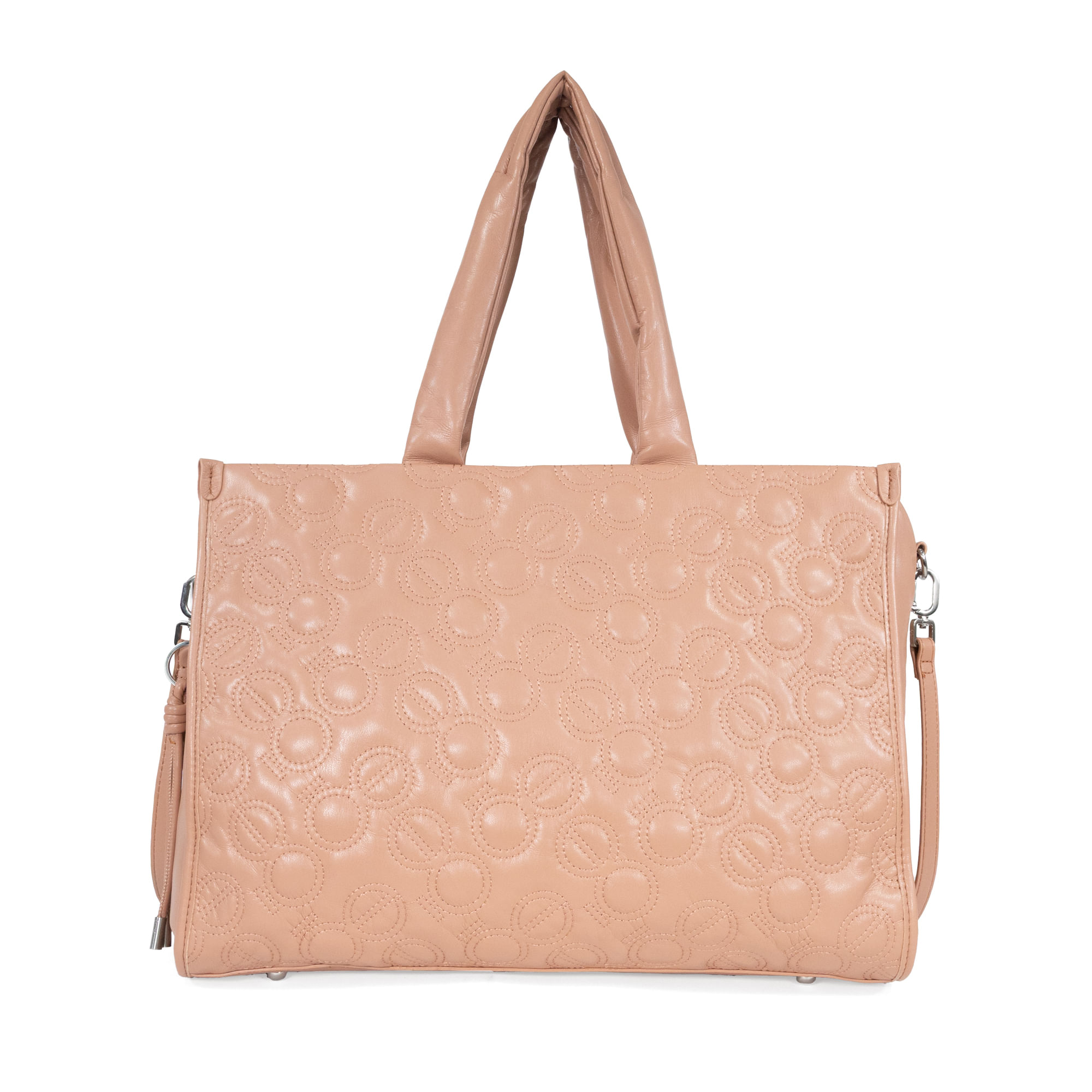 Bolso Tote hecho con material vegano apariencia piel. Cuenta con cierre metálico de larga duración. Diseño de monogramas bordados. Asa de hombro acolchada. Charm decorativo desprendible. Asa larga ajustable y removible.