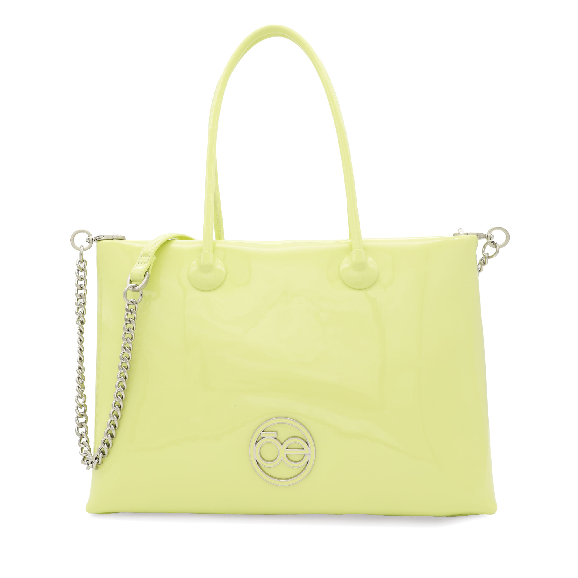 Bolso Tote hecho con material charol. Cuenta con cierre metálico de larga duración. Tiene herraje metálico de monograma. Asa larga de cadena.
