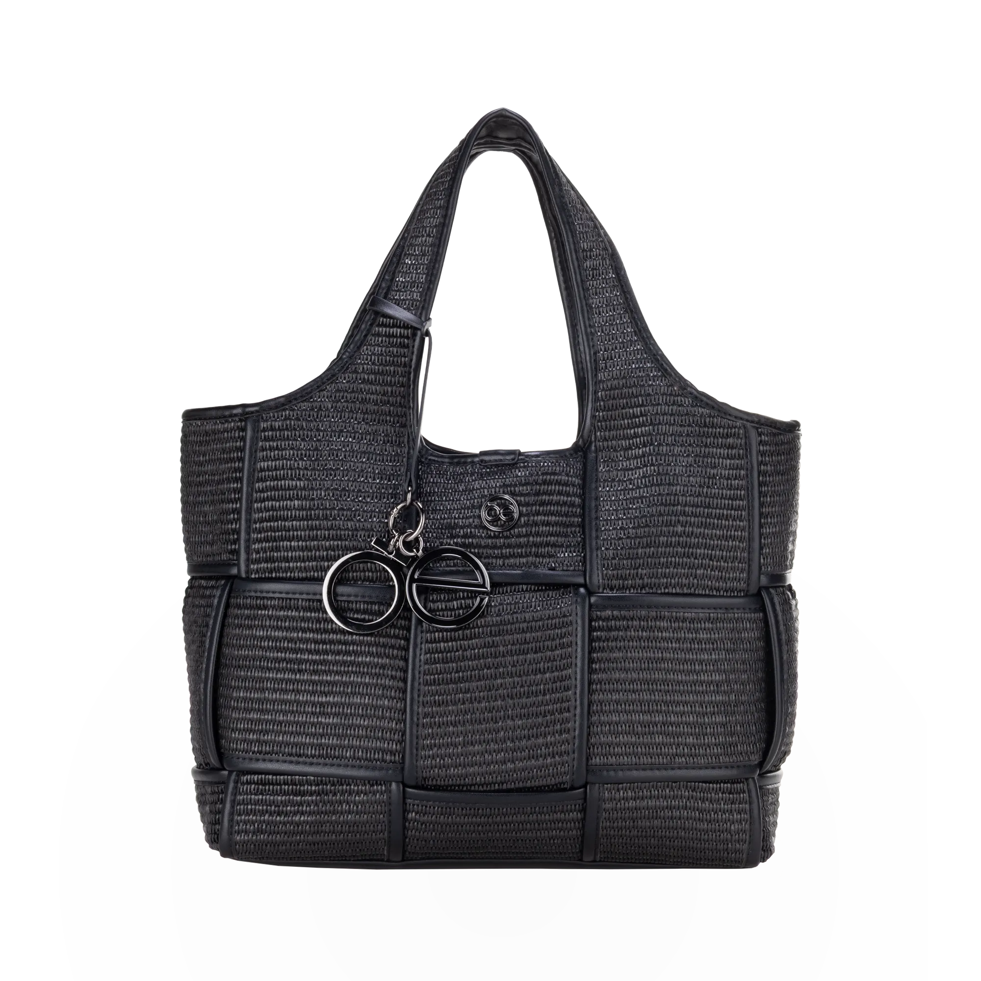 Bolso Tote hecho con material raffia. Cuenta con pouch interno con asa larga desprendible. Asa al hombro. Incluye charm de monograma metálico. Herraje metálico de monograma