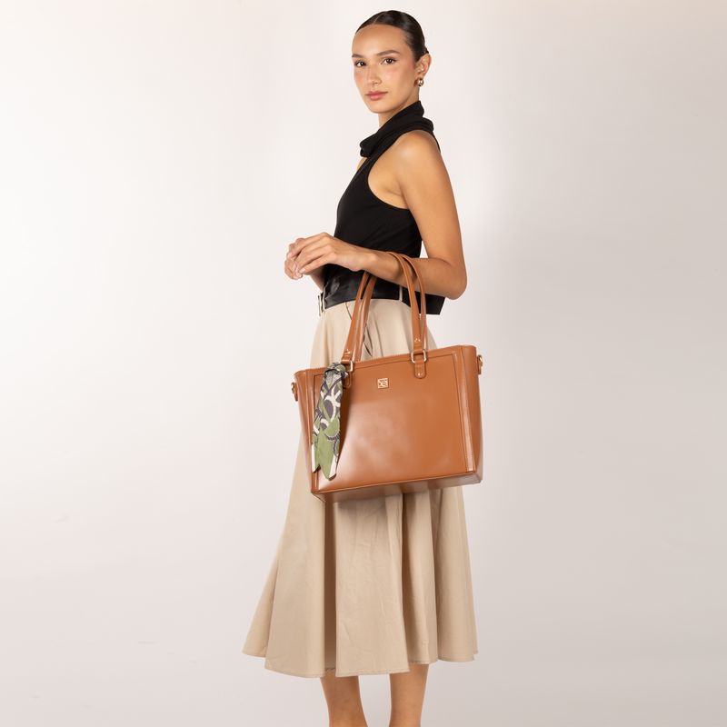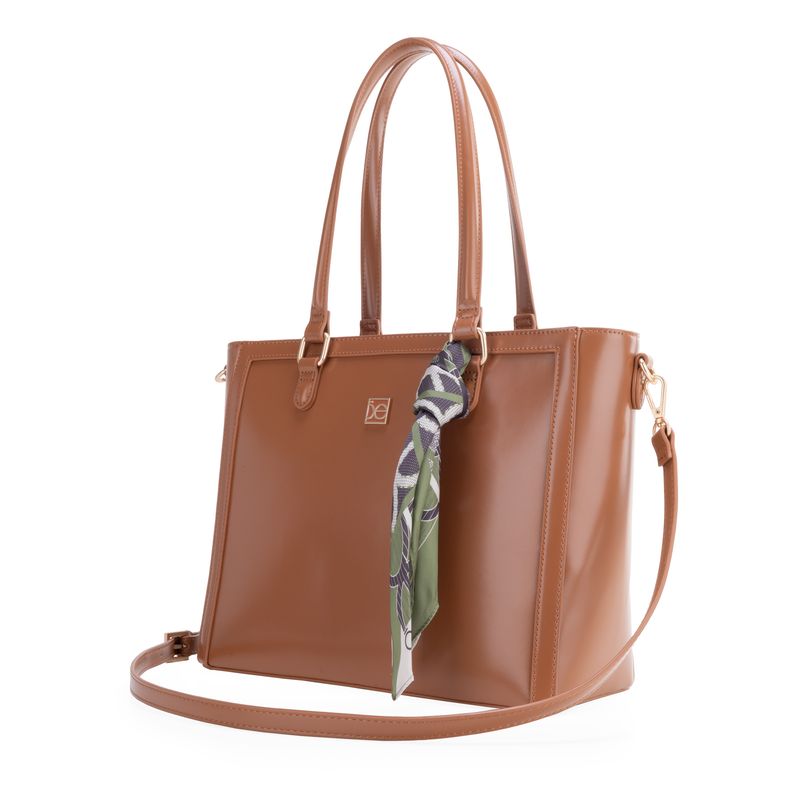 Bolso hecho con material vegano apariencia piel. Cuenta cierre metálico de larga duración. Herraje de monograma. Mascada multiusos desprendible. Compartimento posterior con cierre. Asa larga ajustable y removible.