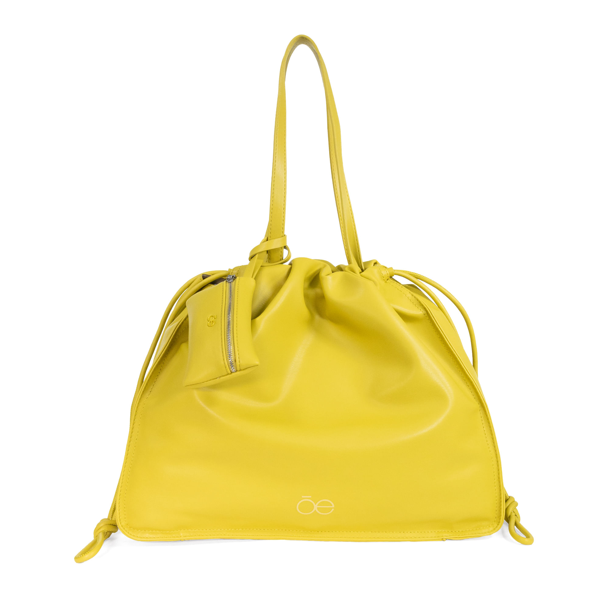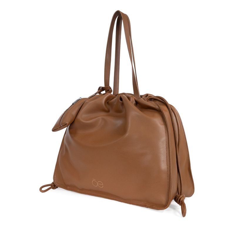 Bolso tote hecho con material vegano apariencia piel. Diseño plisado en parte superior. Jaretas Laterales ajustables. Monedero desprendible.