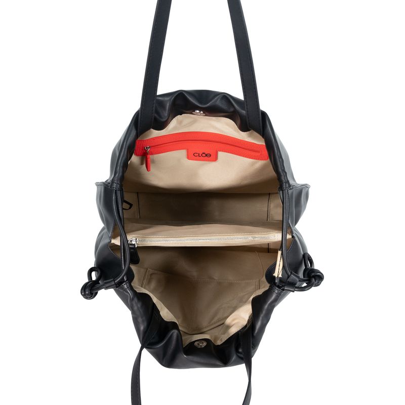 Bolso tote hecho con material vegano apariencia piel. Diseño plisado en parte superior. Jaretas Laterales ajustables. Monedero desprendible.