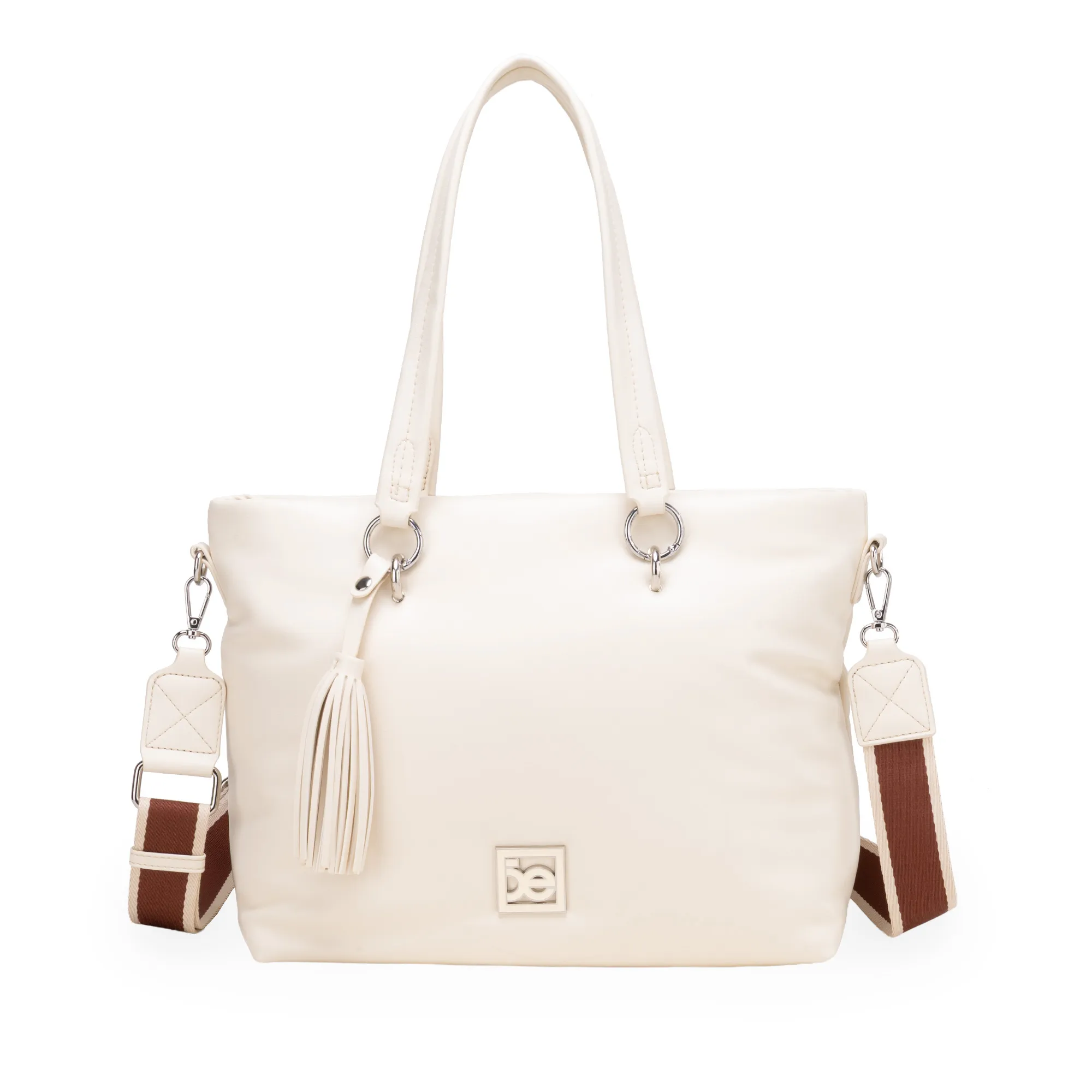 Bolso Tote hecho con material vegano. Cuenta con asa de hombro removible. Asa larga y ajustable y desprendible. Herraje metálico esmaltado de monograma. Incluye tassel decorativo desprendible. Cierre metálico de larga duración