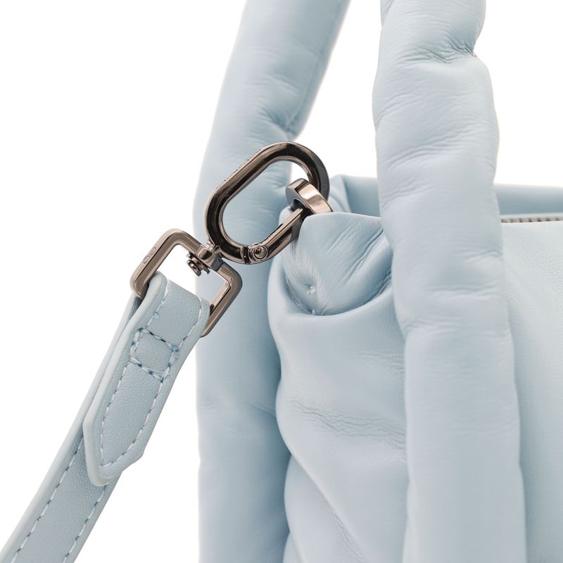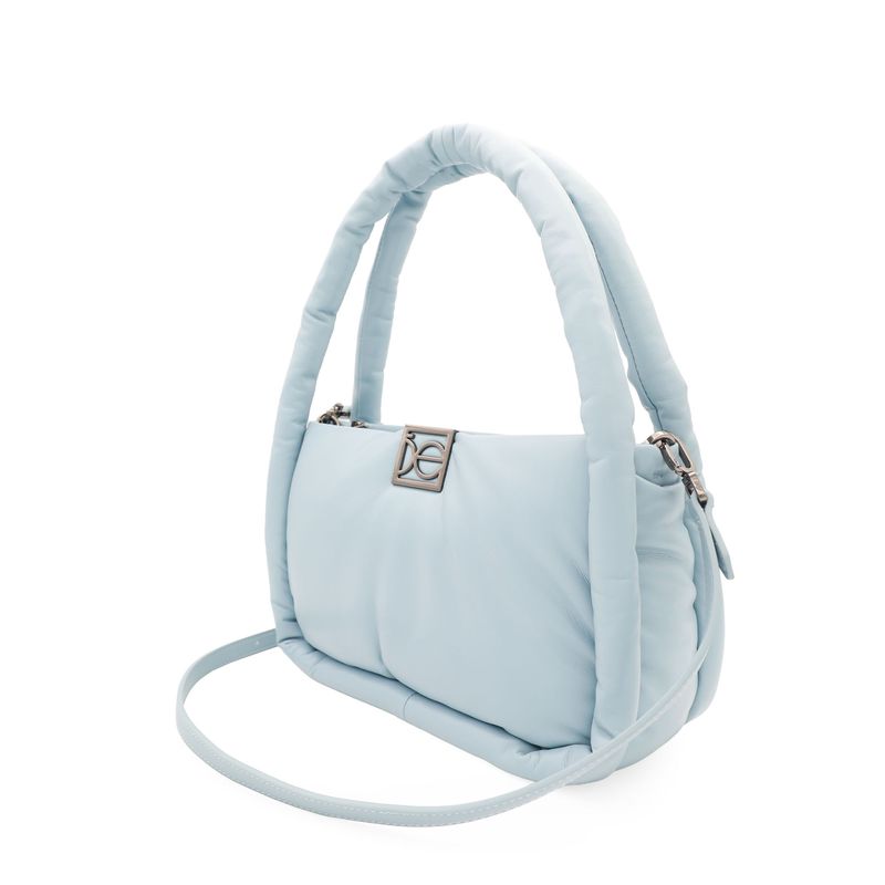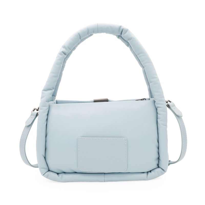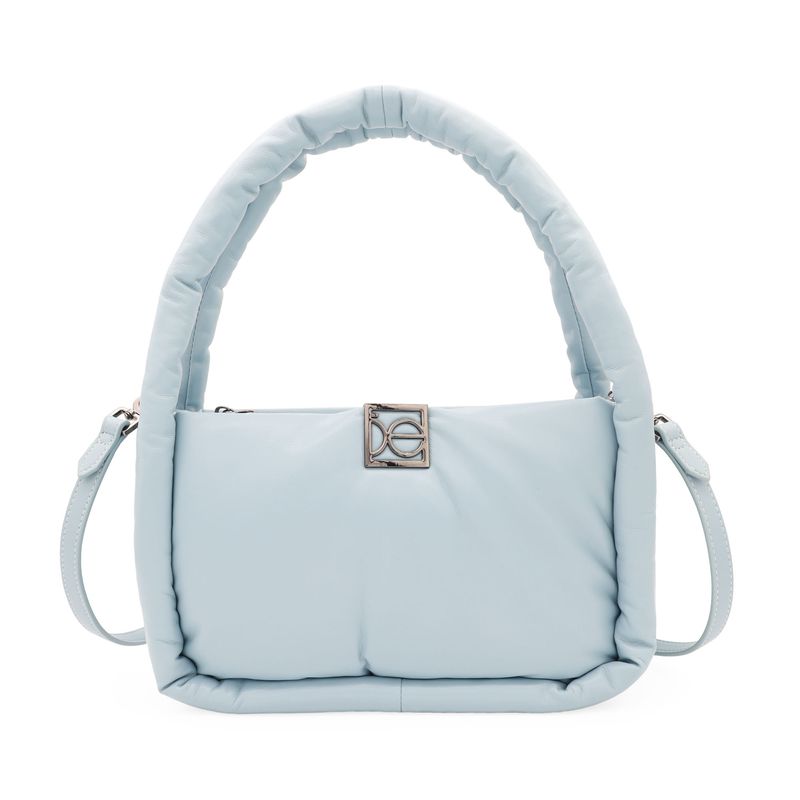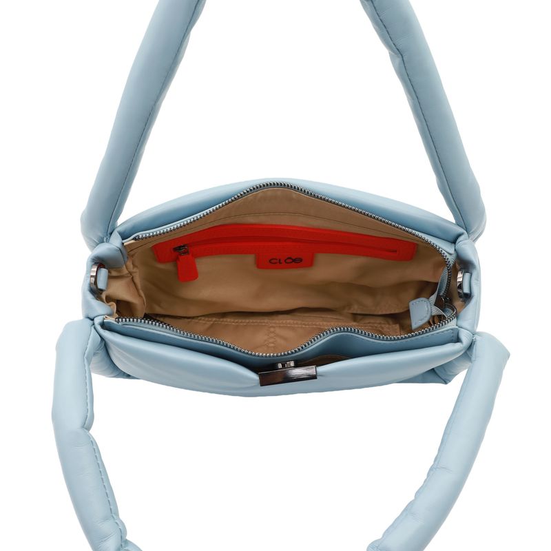Bolso hecho con material vegano apariencia piel. Cuenta con tapeta con broche magnético. Herraje metálico de monograma. Look puffy. Asa larga desprendible.