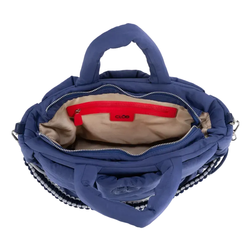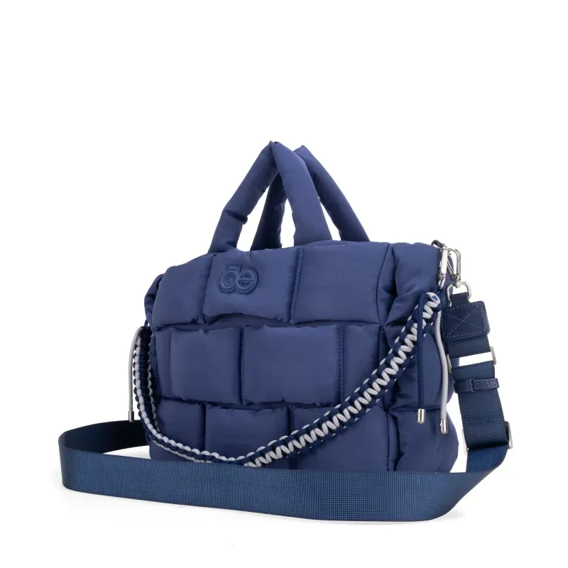 Bolso Tote hecho con material textil. Diseño acolchado de alta tendencia. Cuenta con asa larga ajustable. Asa decorativa desprendible. Tiene cierre metálico de larga duración.