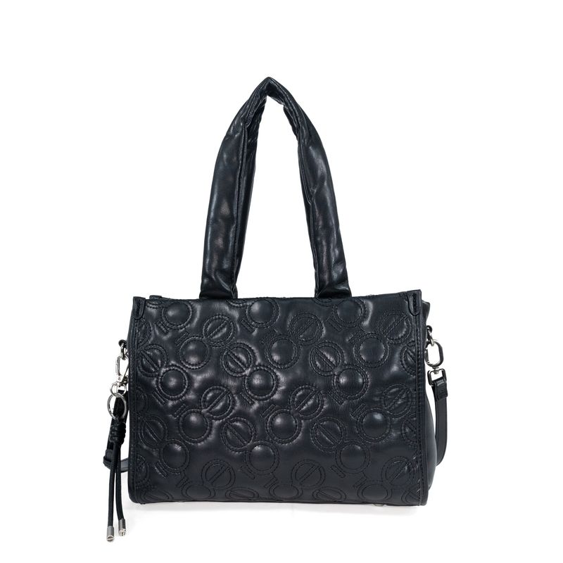 Bolso Tote hecho con material vegano apariencia piel. Cuenta con cierre metálico de larga duración. Diseño de monogramas bordados. Asa de hombro acolchada. Charm decorativo desprendible. Asa larga ajustable y removible.