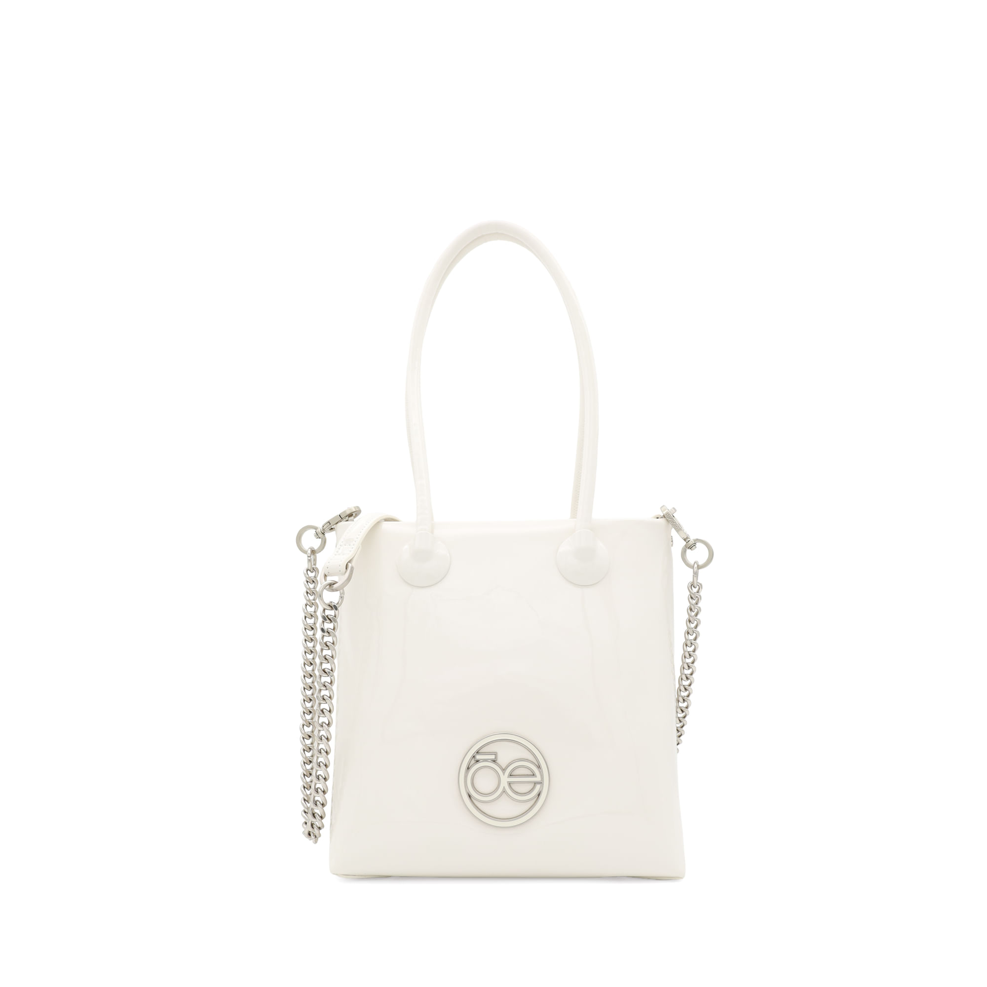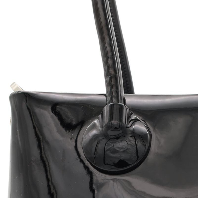 Bolso Tote hecho con material charol. Cuenta con cierre metálico de larga duración. Tiene herraje metálico de monograma. Asa larga de cadena.
