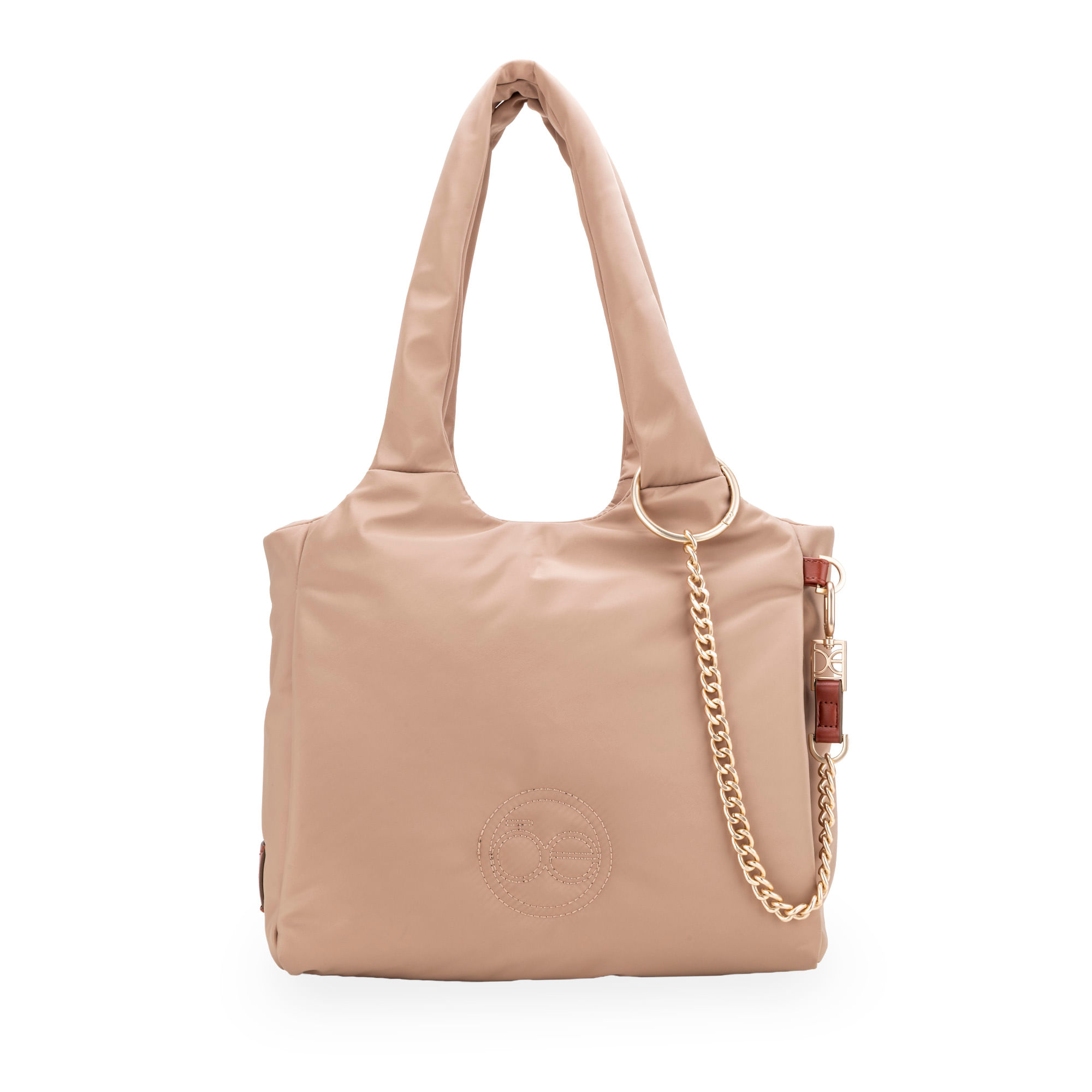 Bolso Tote hecho con material textil. Cuenta con cierre metálico de larga duración. Compartimentos laterales con cierre de larga duración. Incluye cadena decorativa con monograma removible.