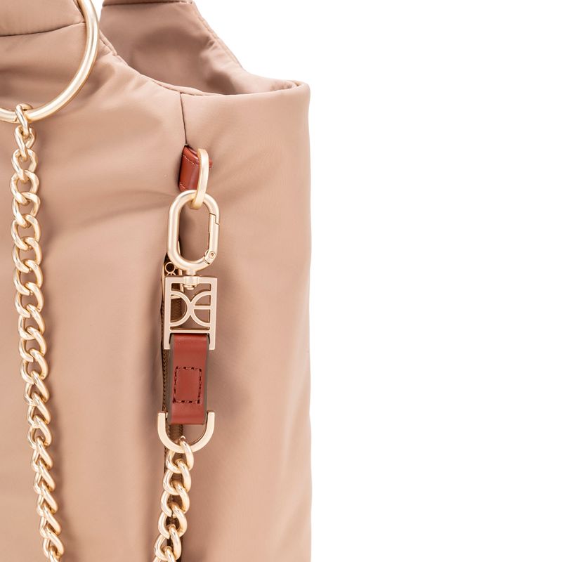 Bolso Tote hecho con material textil. Cuenta con cierre metálico de larga duración. Compartimentos laterales con cierre de larga duración. Incluye cadena decorativa con monograma removible.