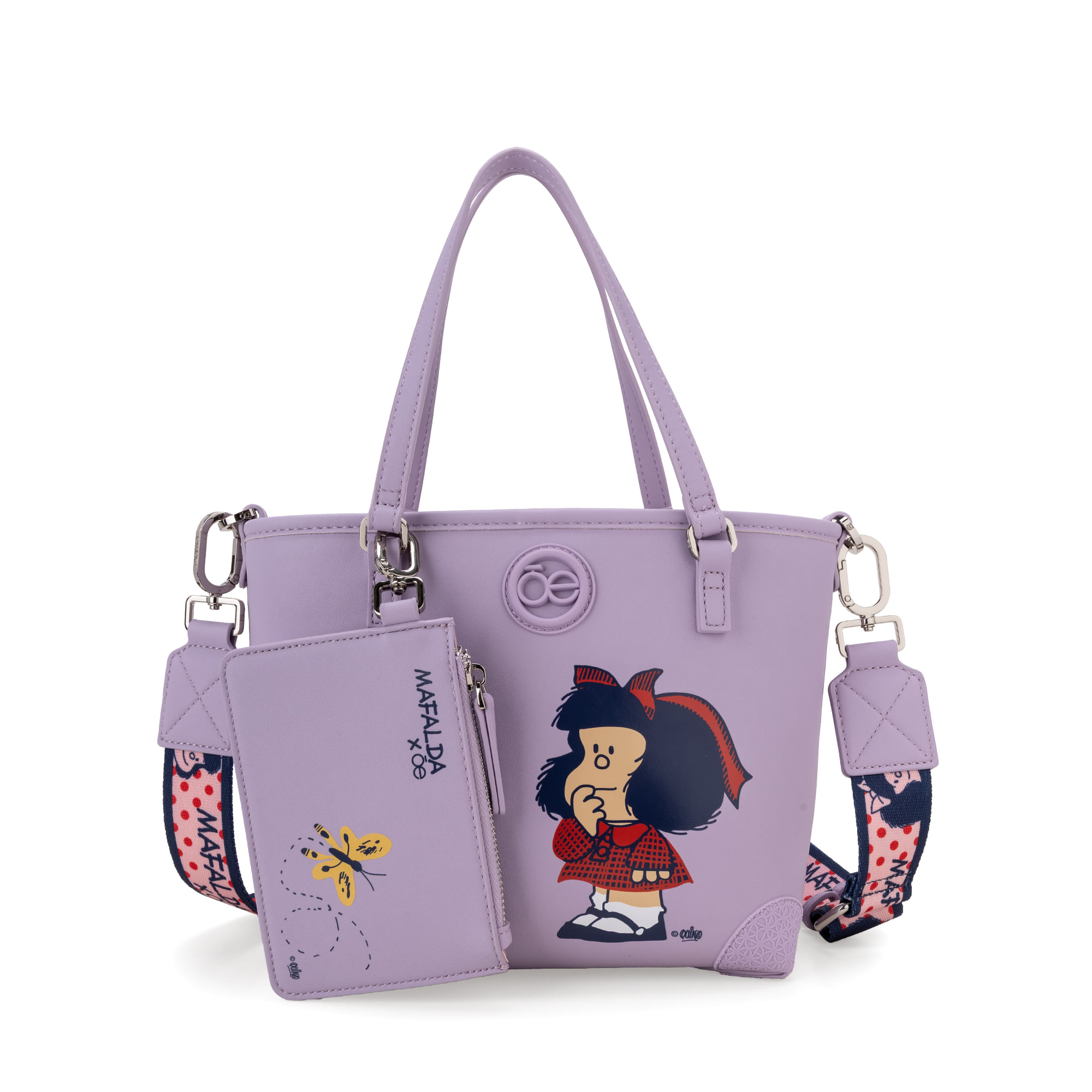 Bolso Tote hecho de material vegano apariencia piel. Cuenta con rubber de monograma. Monedero desprendible. Estampado icónico Oe x MAFALDA. Asa larga ajustable y removible.