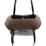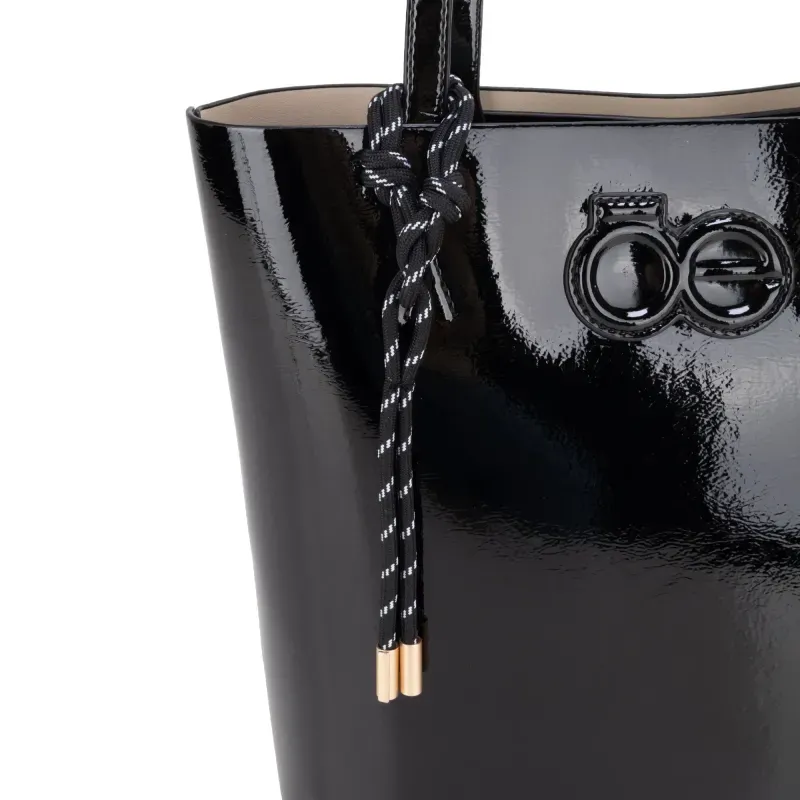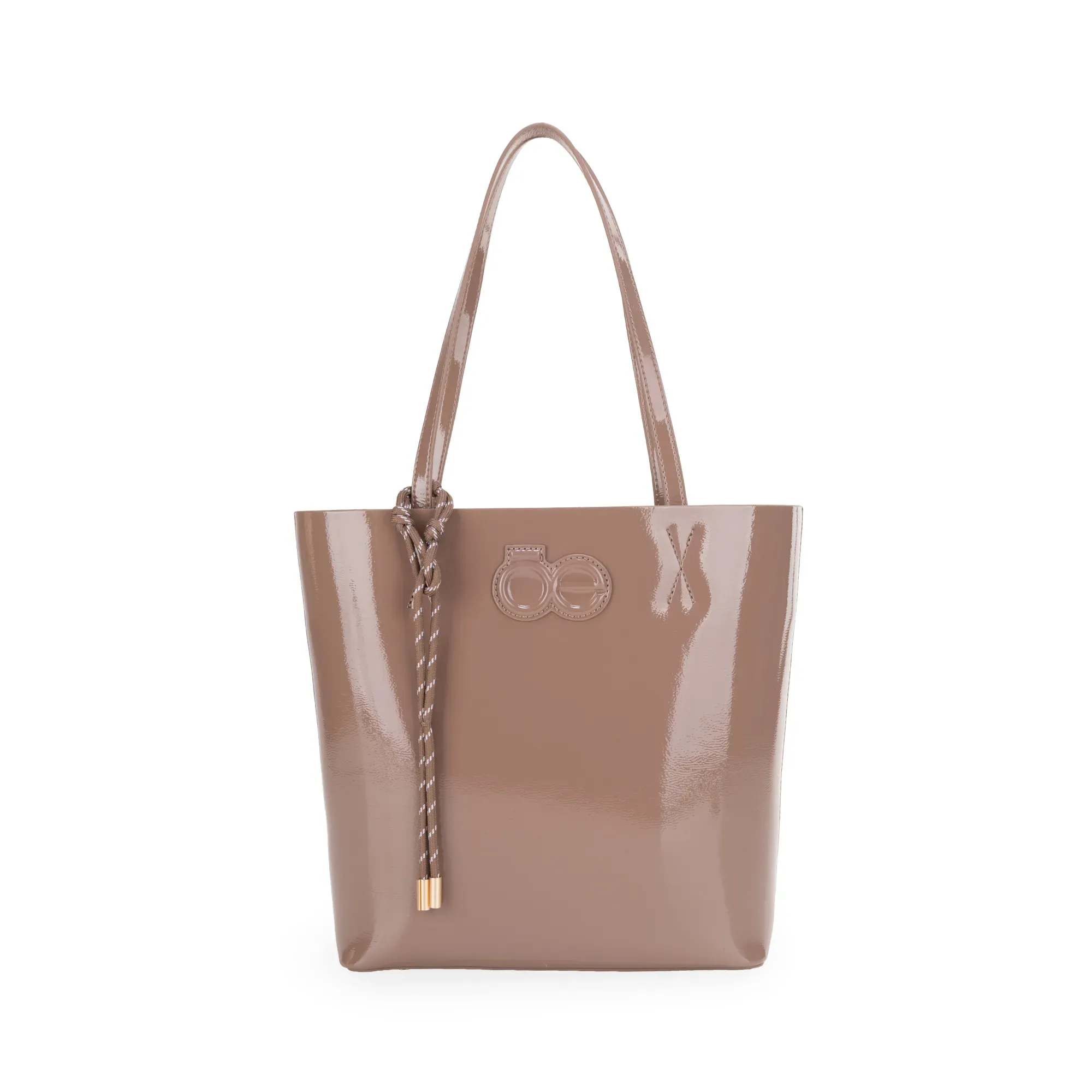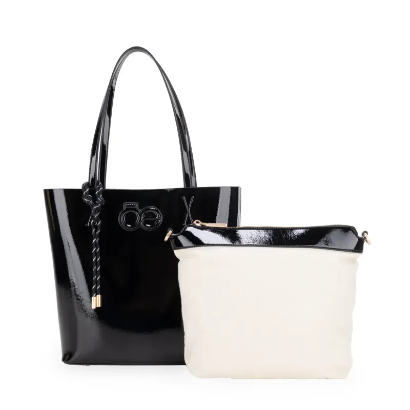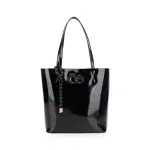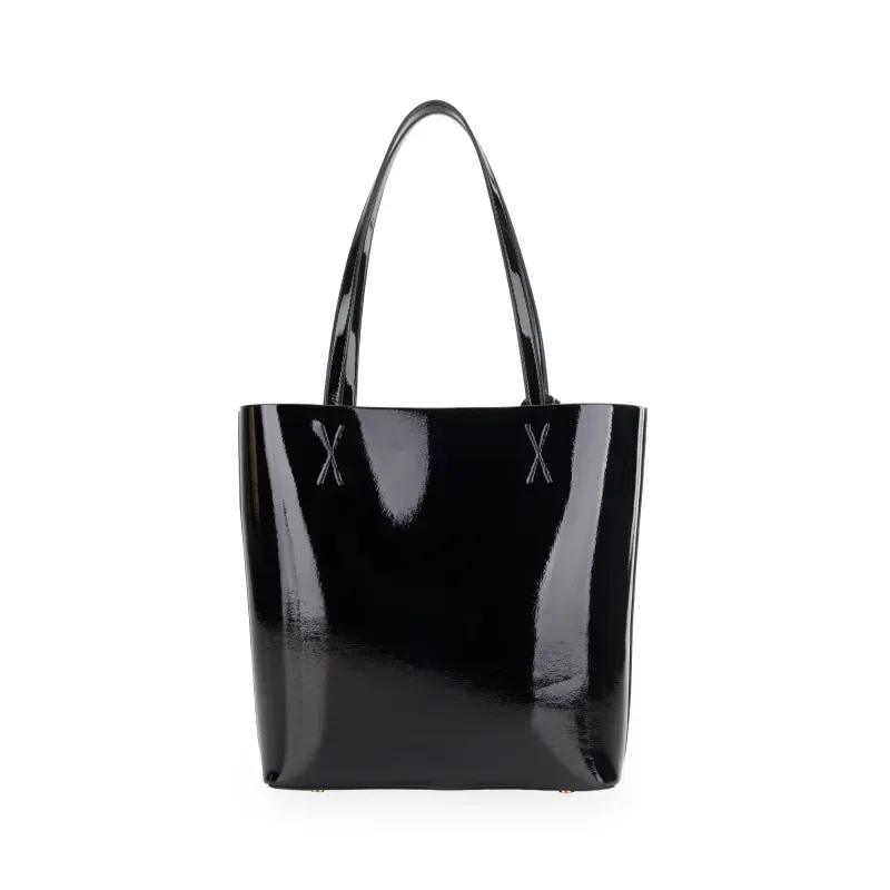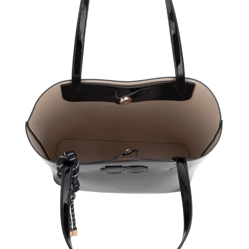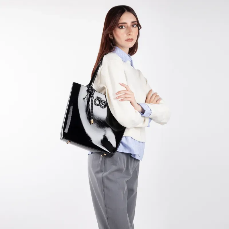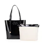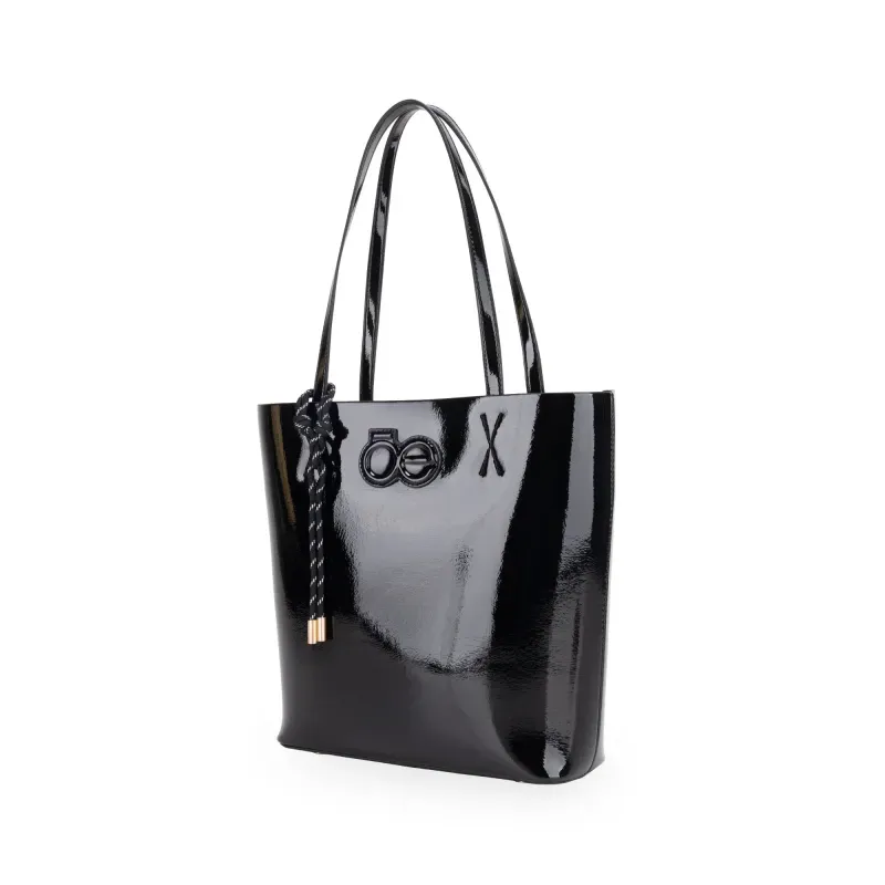 Bolso Tote hecho con material vegano acabado glossy. Cuenta con charm decorativo. Parche de monograma. Incluye pouch interno con asa larga para uso individual.