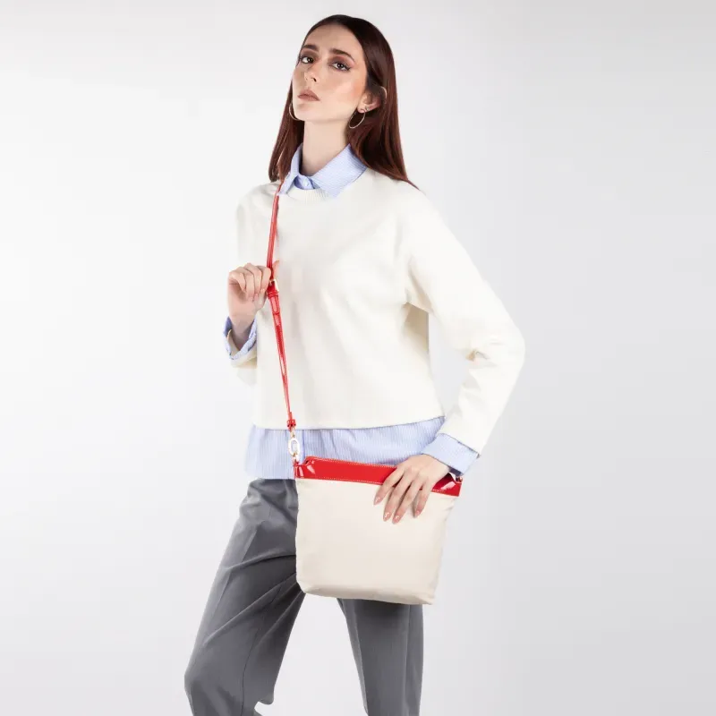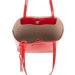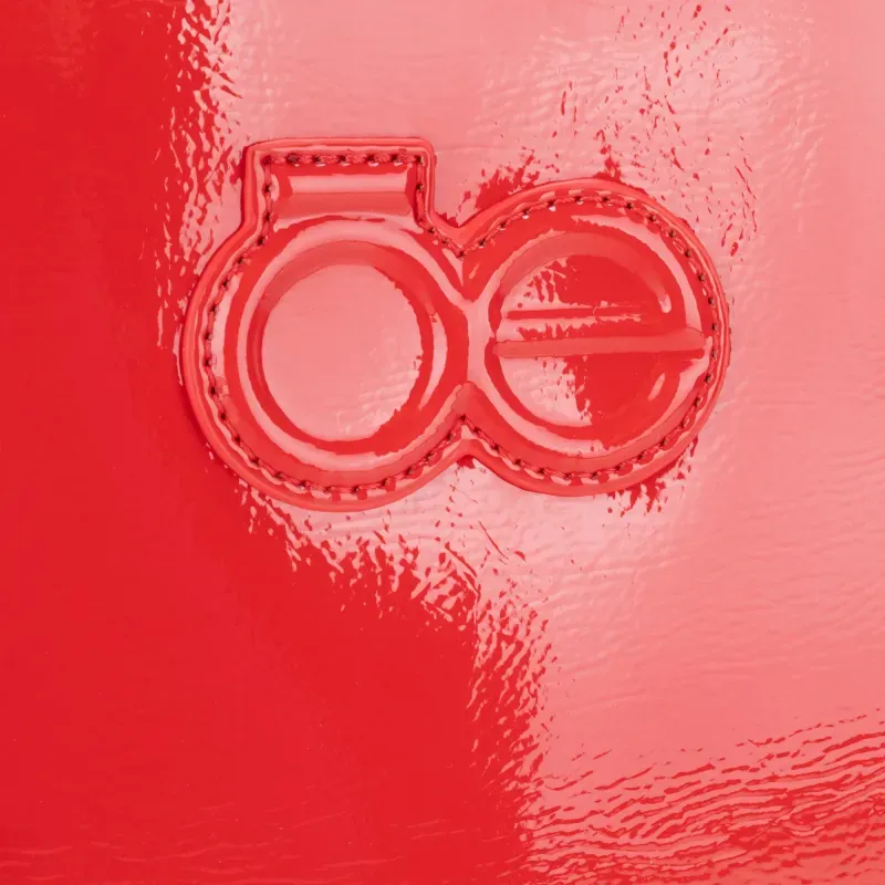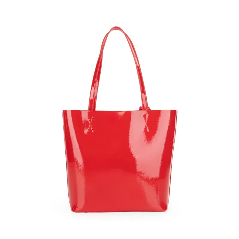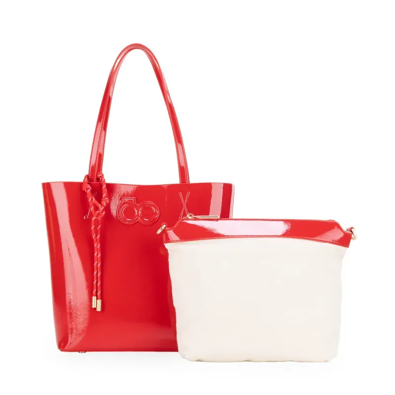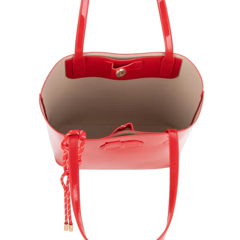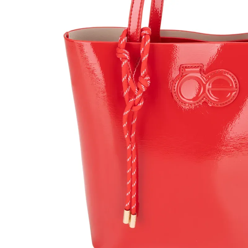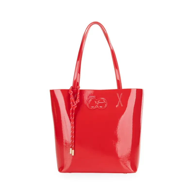 Bolso Tote hecho con material vegano acabado glossy. Cuenta con charm decorativo. Parche de monograma. Incluye pouch interno con asa larga para uso individual.
