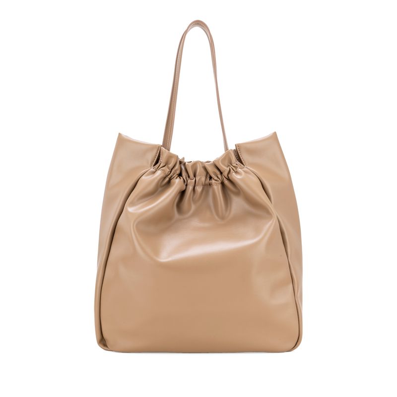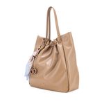 Bolso Tote hecho con material vegano apariencia piel. Cuenta con diseño de pliegues en la parte superior del bolso. Asas de hombro reforzadas. Incluye charm de monograma con mascada multiusos desprendible. Asa larga ajustable y removible.