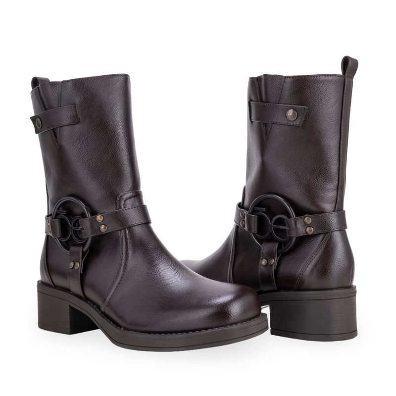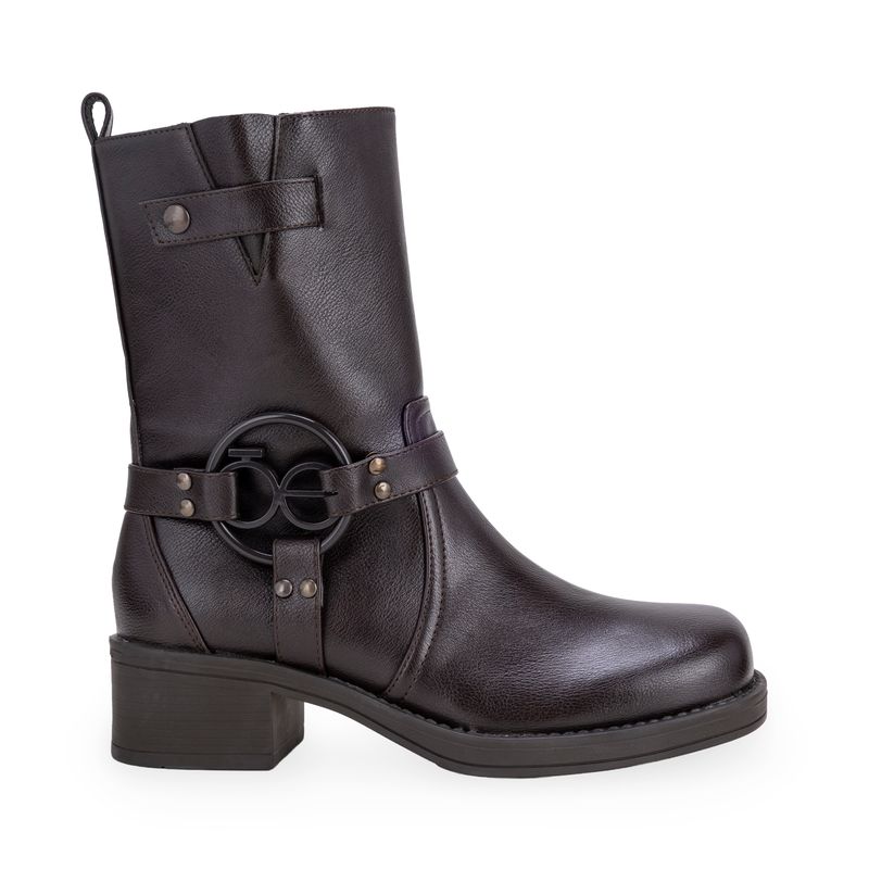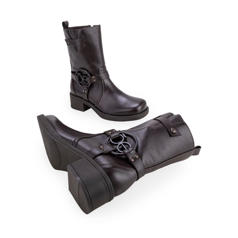 Bota hecha con material vegano apriencia piel. Cuenta con herraje de monograma. Diseño de punta cuadrada. Tacón cuadrado para mayor comodidad. Cierre de larga duración lateral.