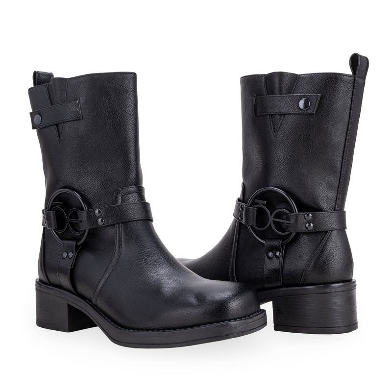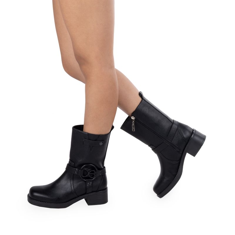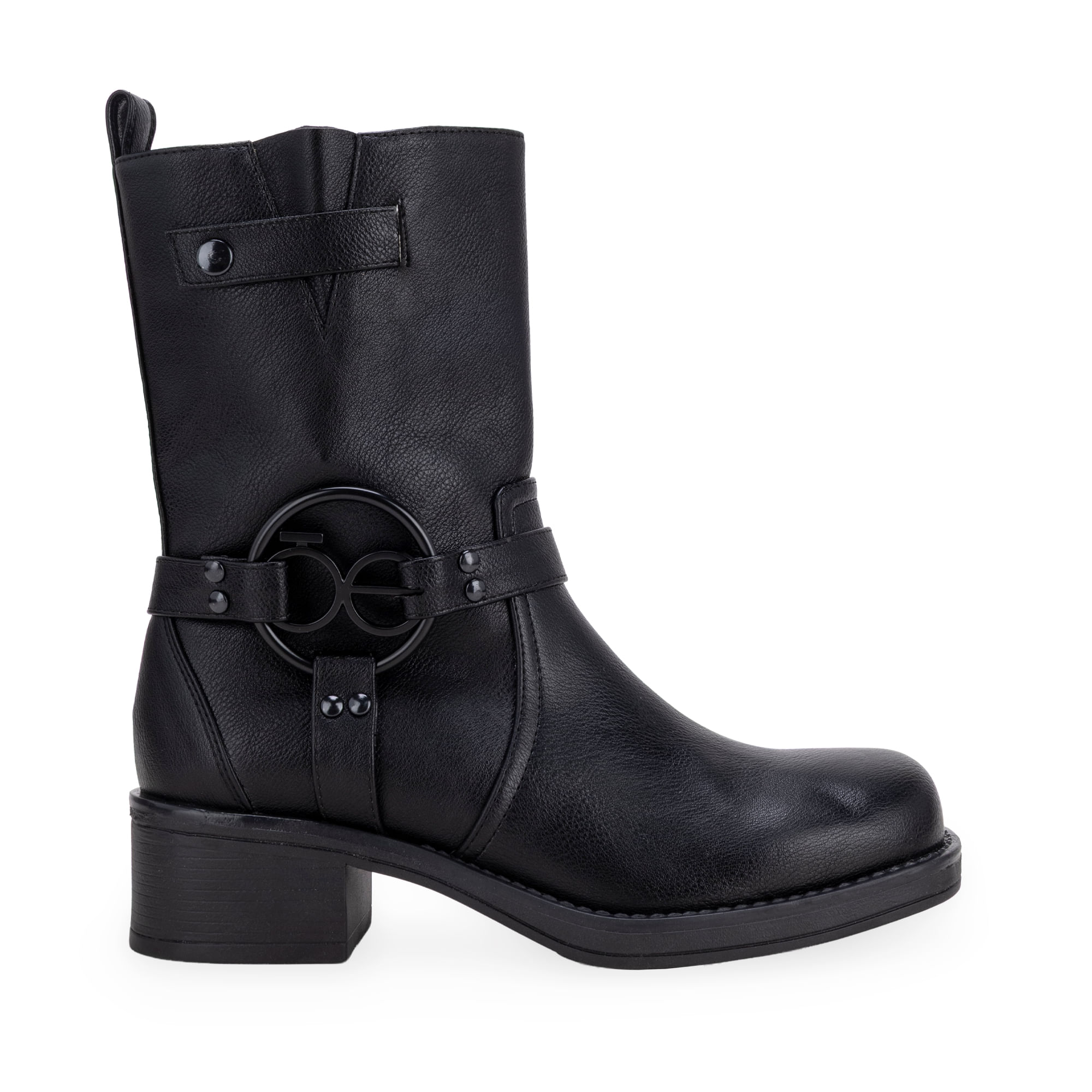 Bota hecha con material vegano apriencia piel. Cuenta con herraje de monograma. Diseño de punta cuadrada. Tacón cuadrado para mayor comodidad. Cierre de larga duración lateral.