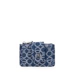 Billetera hecha con material vegano apariencia piel. Cuenta con herraje metálico de monograma. Múltiples espacios para tarjetas. Compartimento con cierre metálico para monedas.