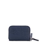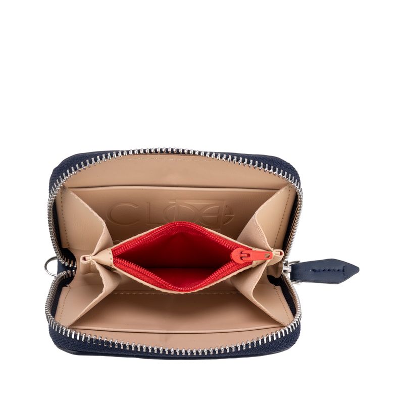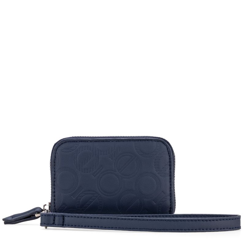 Billetera hecha con material vegano apariencia piel. Diseño de troquelado de monogramas. Cuenta con cierre metálico de larga duración. Incluye maneral de fácil uso. Múltiples compartimentos internos para tarjetas y monedas.