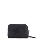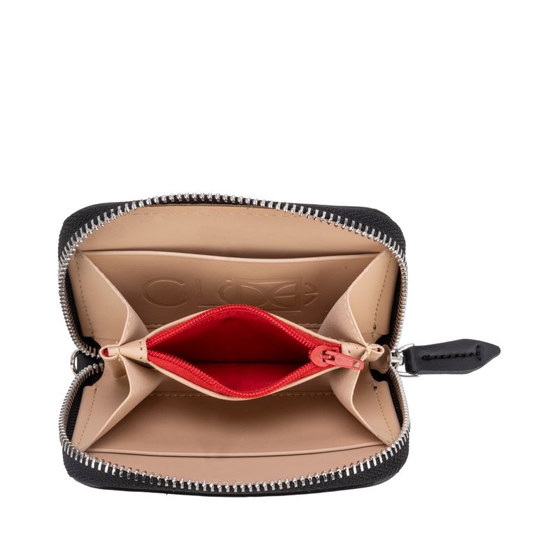 Billetera hecha con material vegano apariencia piel. Diseño de troquelado de monogramas. Cuenta con cierre metálico de larga duración. Incluye maneral de fácil uso. Múltiples compartimentos internos para tarjetas y monedas.