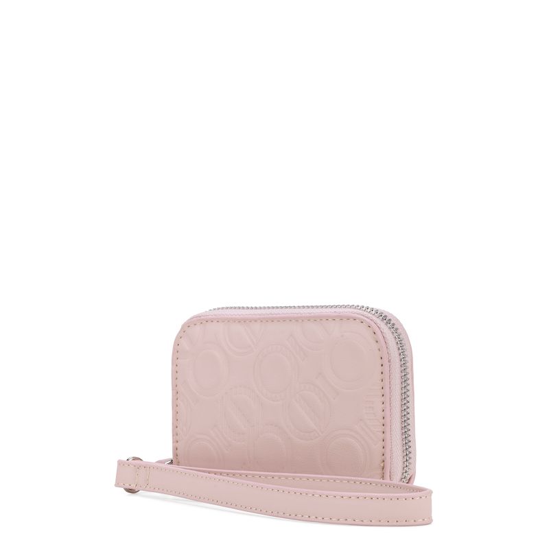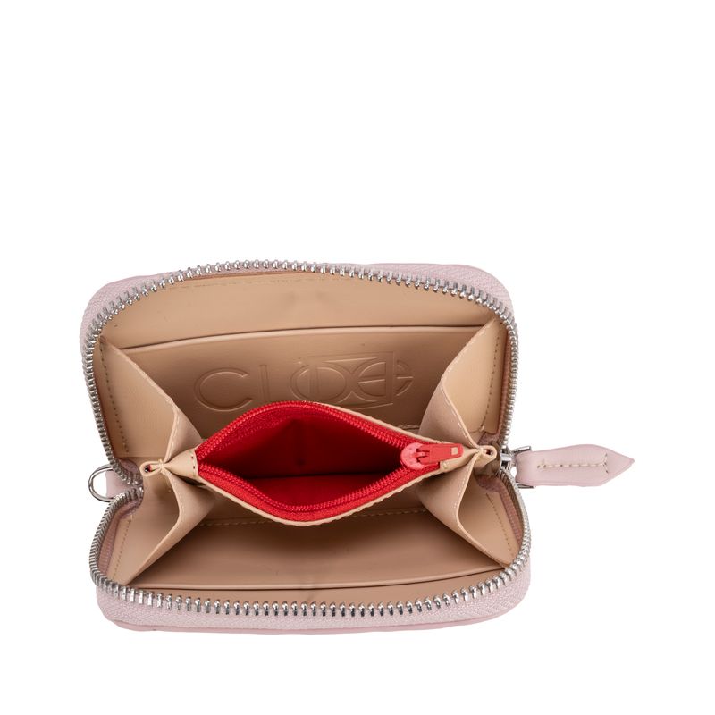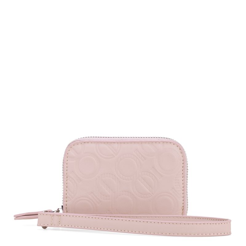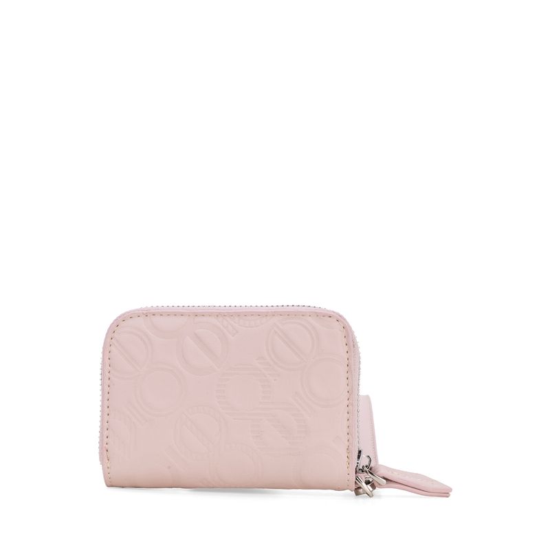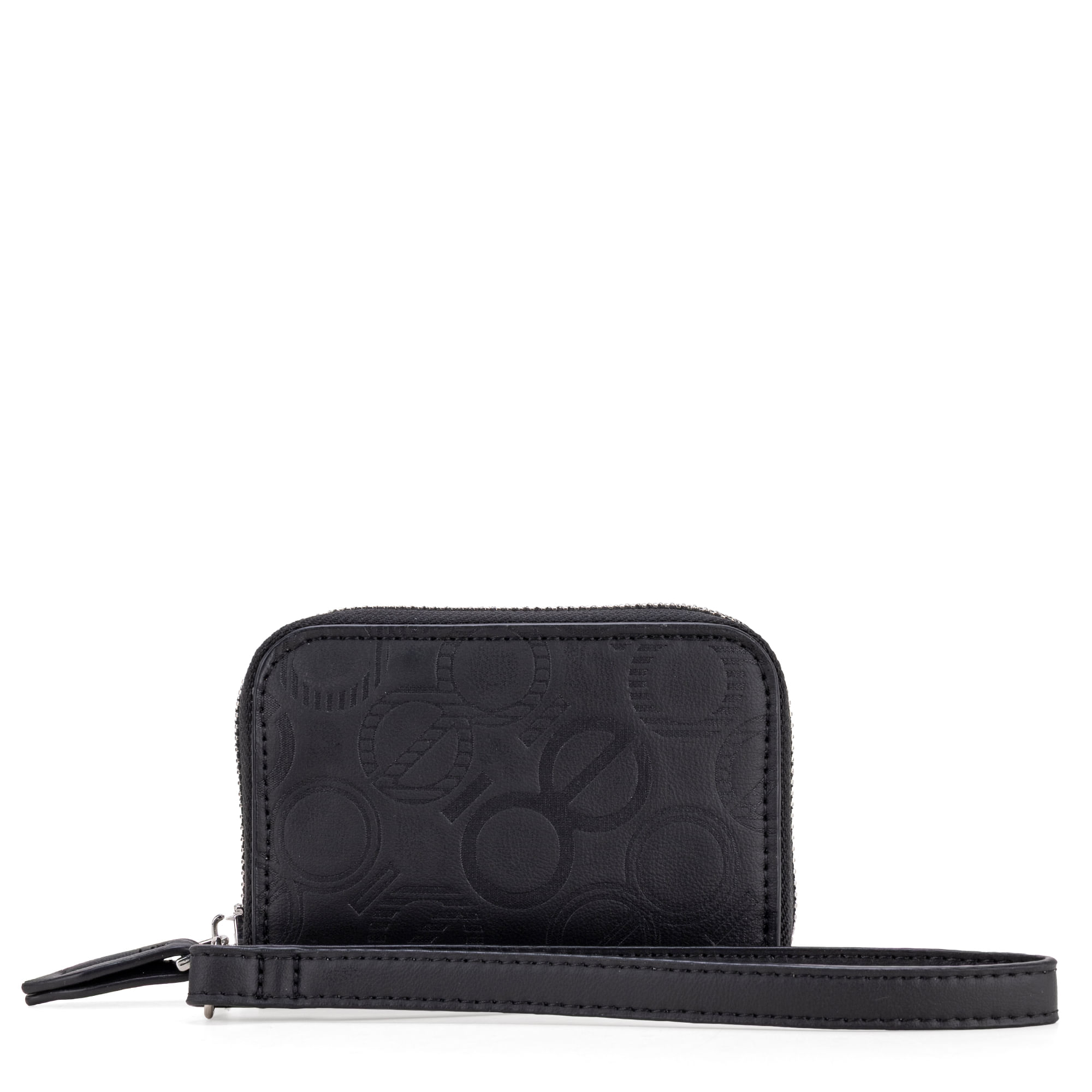 Billetera hecha con material vegano apariencia piel. Diseño de troquelado de monogramas. Cuenta con cierre metálico de larga duración. Incluye maneral de fácil uso. Múltiples compartimentos internos para tarjetas y monedas.
