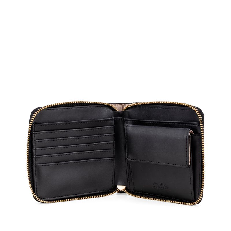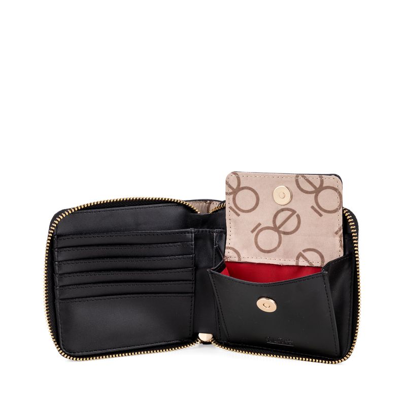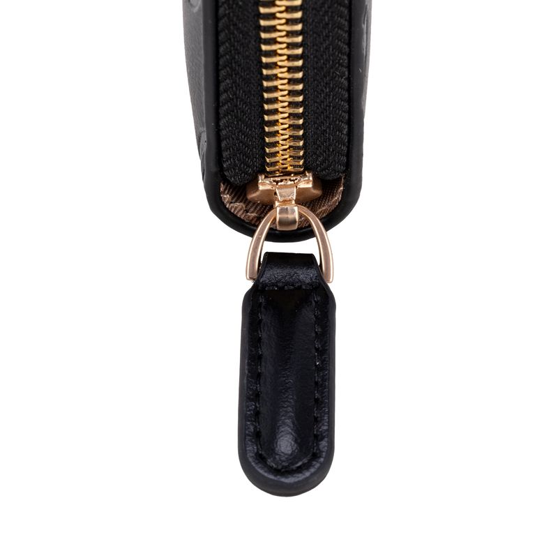 Cartera hecha con material vegano apariencia piel. Cuenta con cierre metálico de larga duración. Diseño de monogramas troquelados. Múltiples compartimentos internos para billetes y tarjetas.