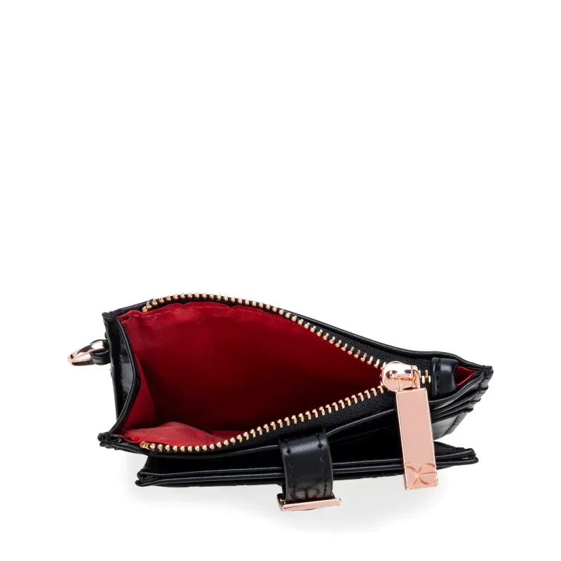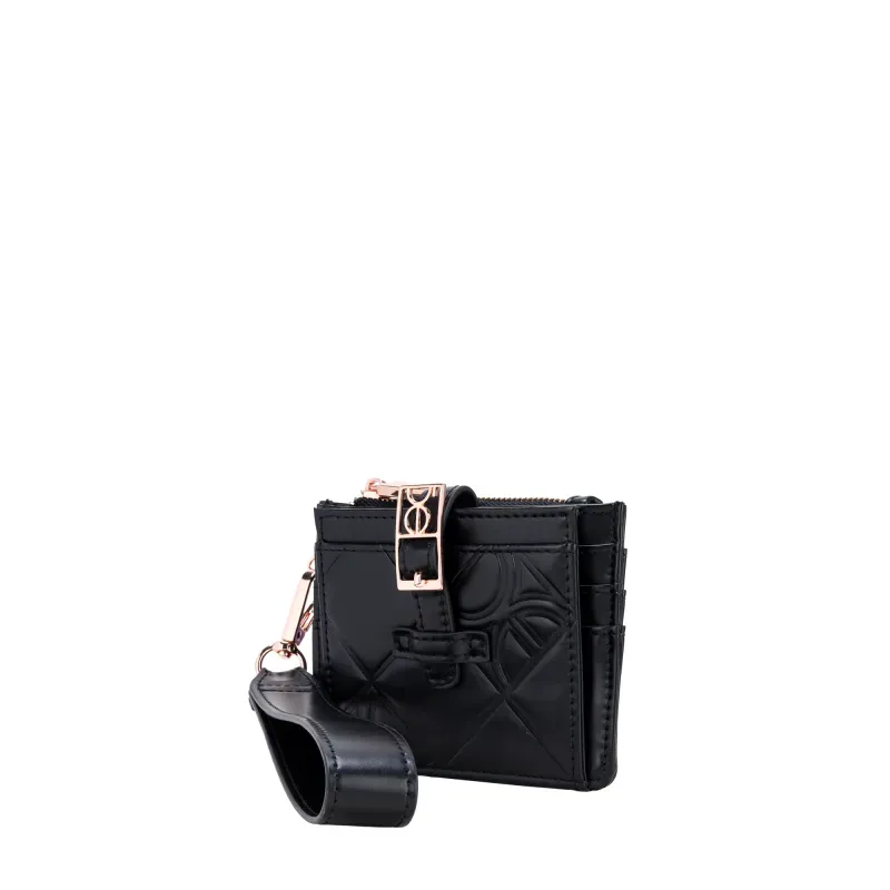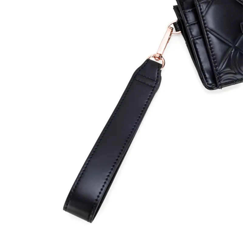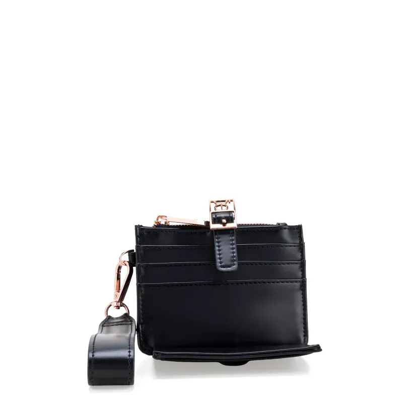 Billetera hecha de material vegano. Cuenta con maneral de fácil uso desprendible. Múltiples compartimientos internos. Tiene hebilla de metal con monograma.