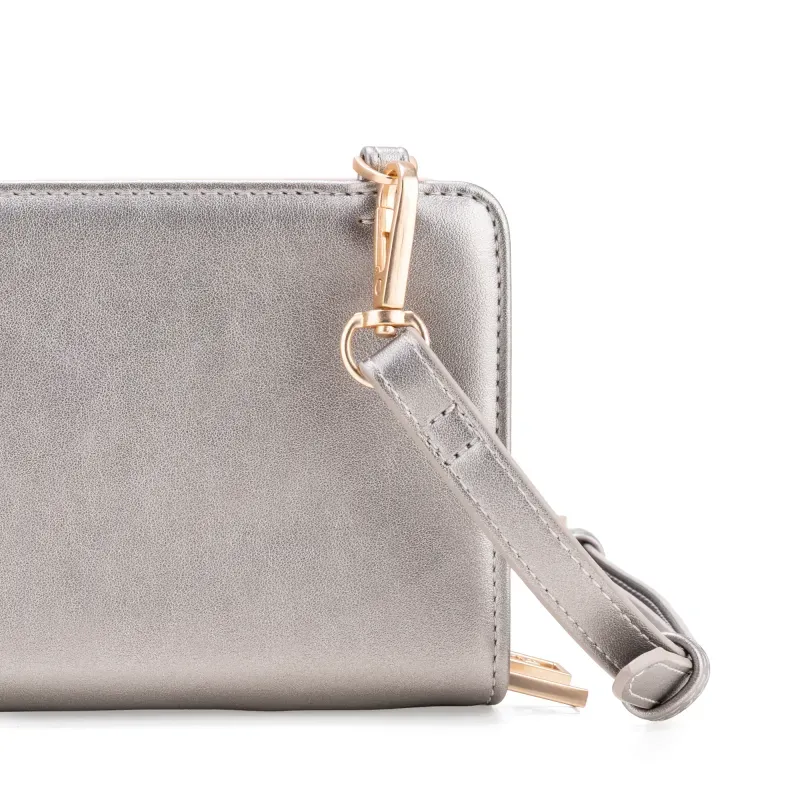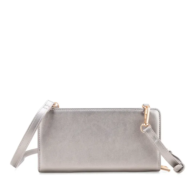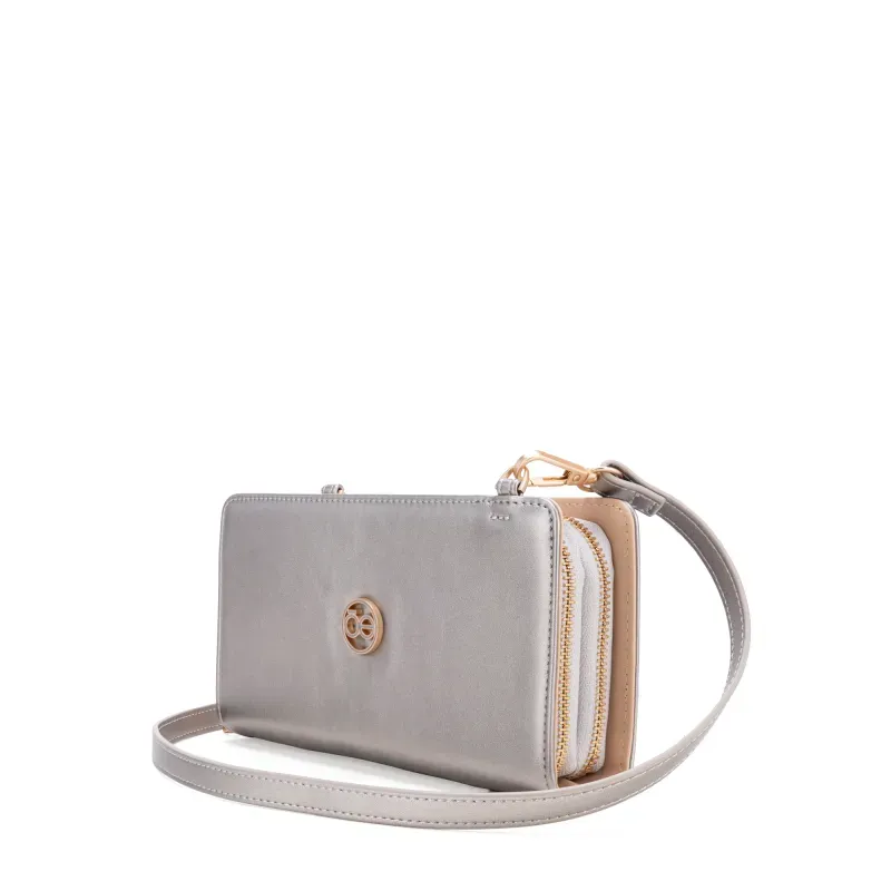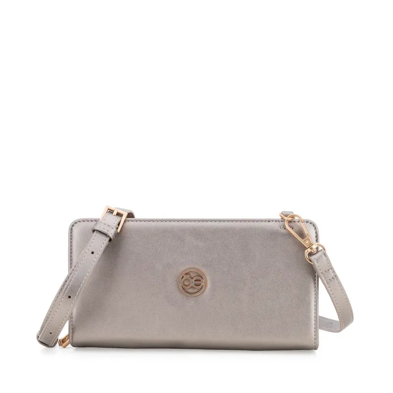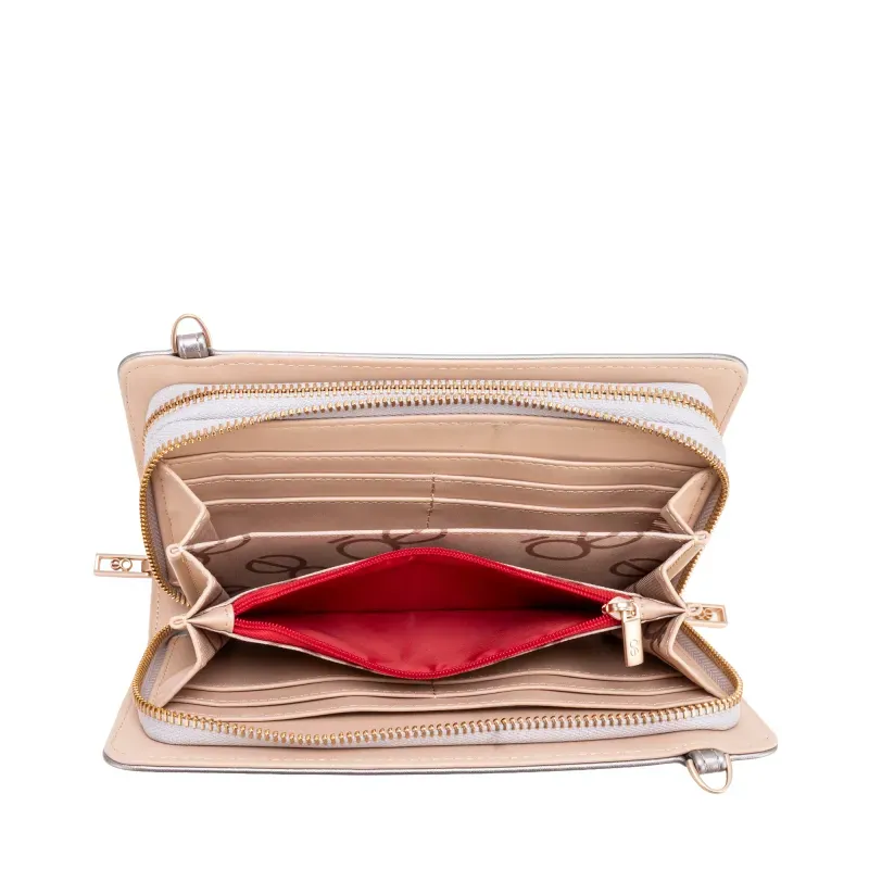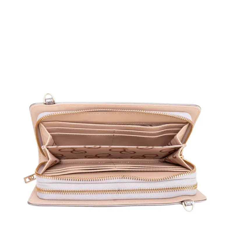 Billetera Cierre Doble hecha de material vegano. Cuenta con herraje metálico de monograma. Cierre metálico de larga duración. Múltiples compartimentos internos para tarjetas y billetes. Incluye asa larga ajustable y removible.