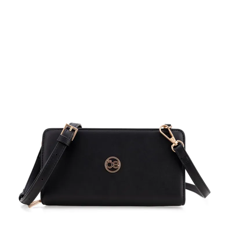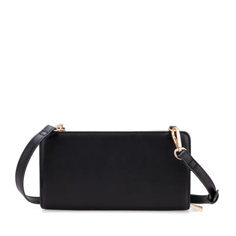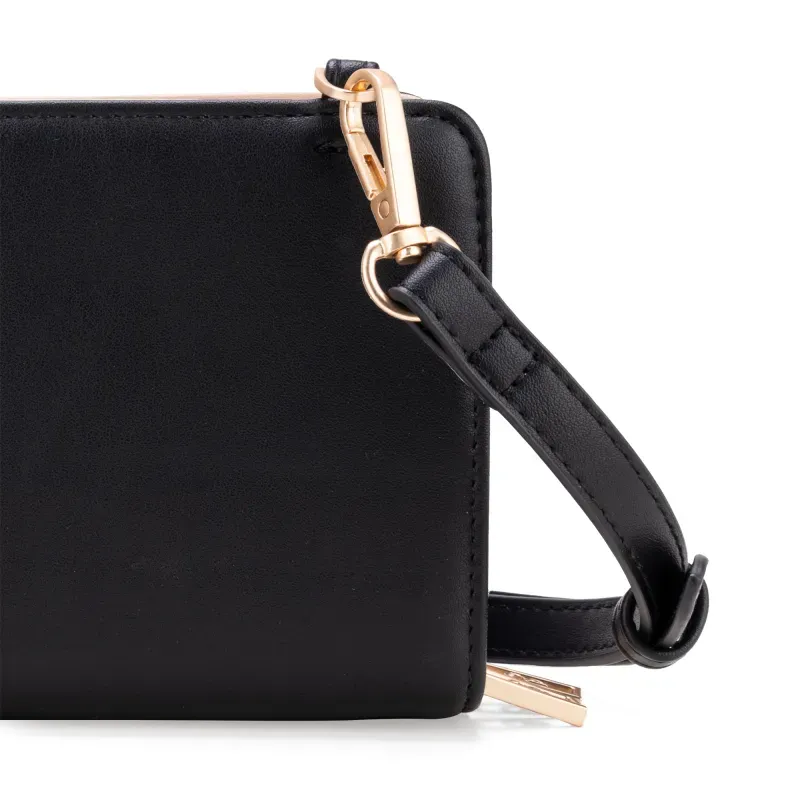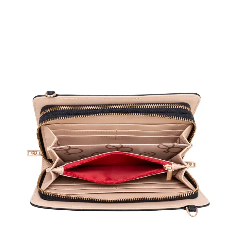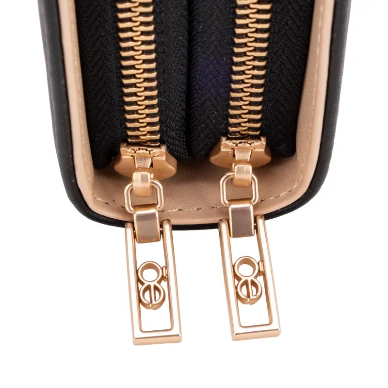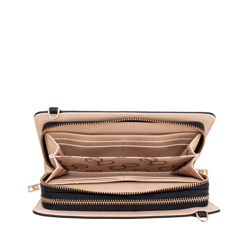 Billetera Cierre Doble hecha de material vegano. Cuenta con herraje metálico de monograma. Cierre metálico de larga duración. Múltiples compartimentos internos para tarjetas y billetes. Incluye asa larga ajustable y removible.