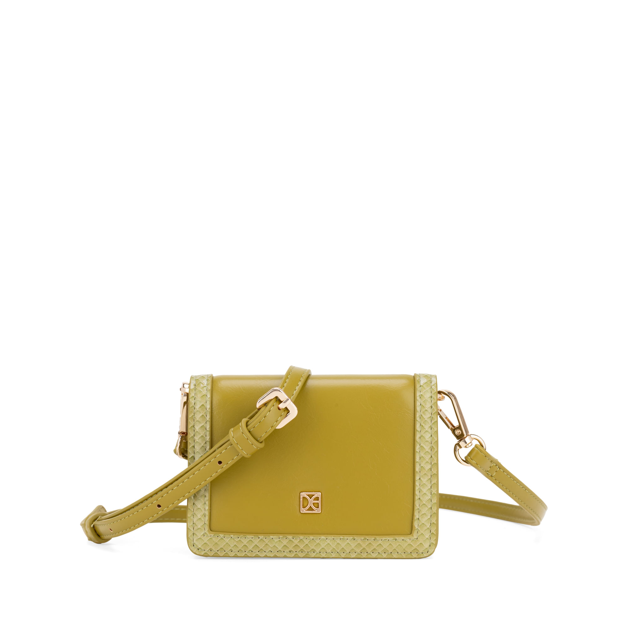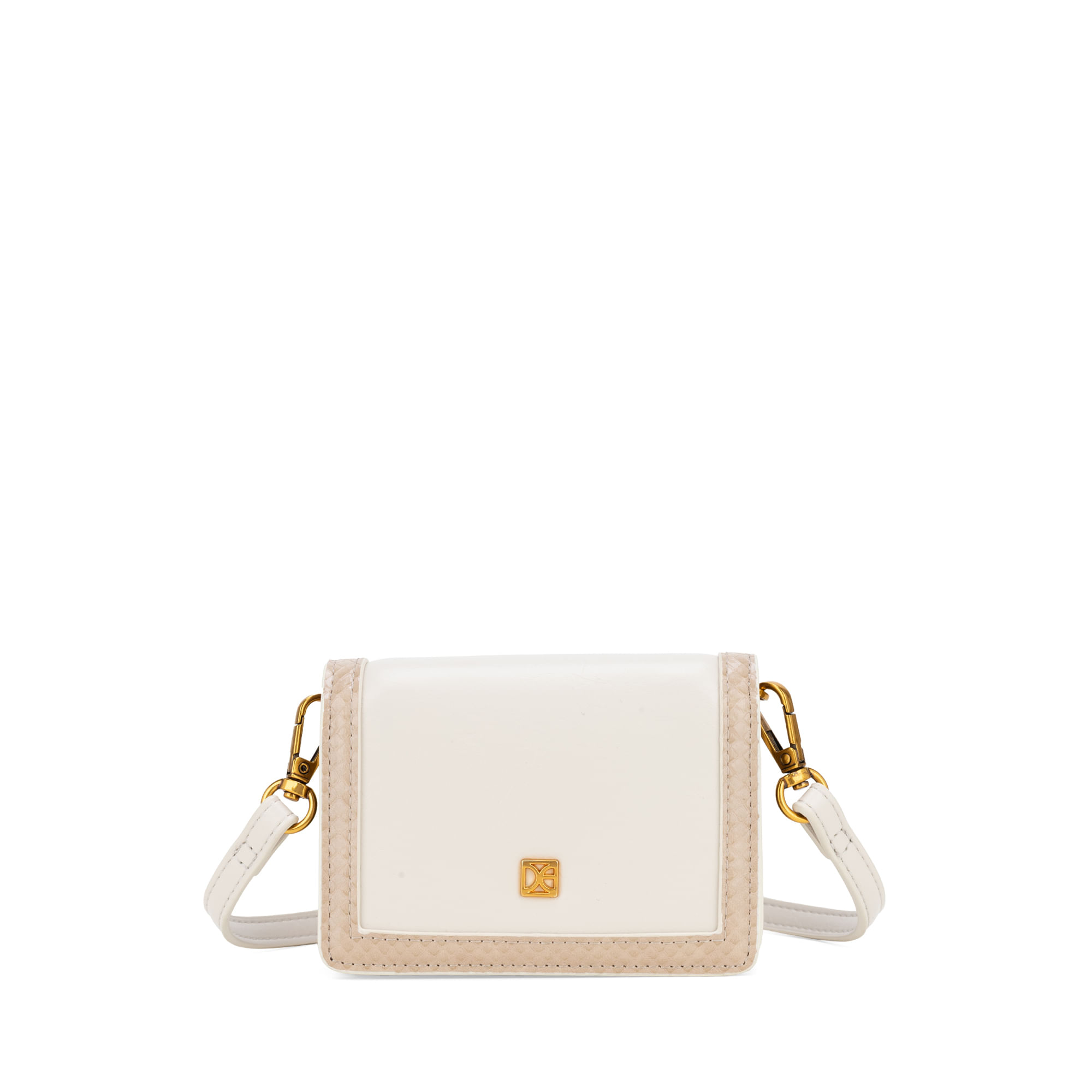 Billetera hecha con material vegano apariencia piel. Cuenta con herraje metálico de monograma. Tiene tapeta con broche magnético. Asa larga ajustable y removible.