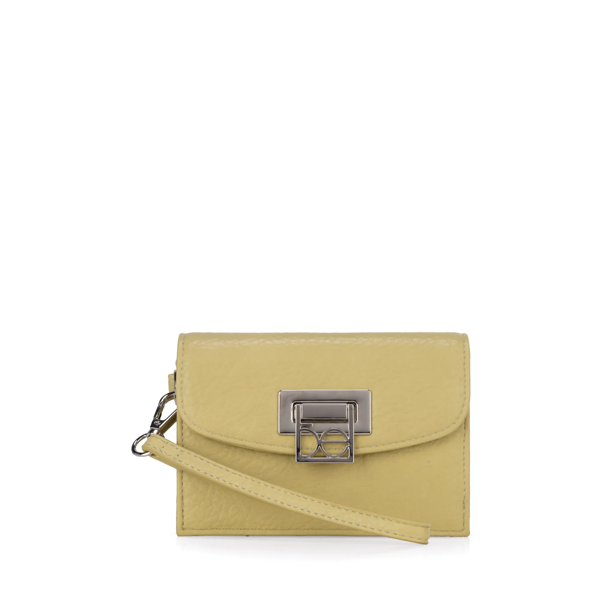 Billetera hecha con material vegano apariencia piel. Cuenta con tapeta con broche de monograma. Maneral lateral desprendible. Monedero interno. Múltiples compartimentos internos.