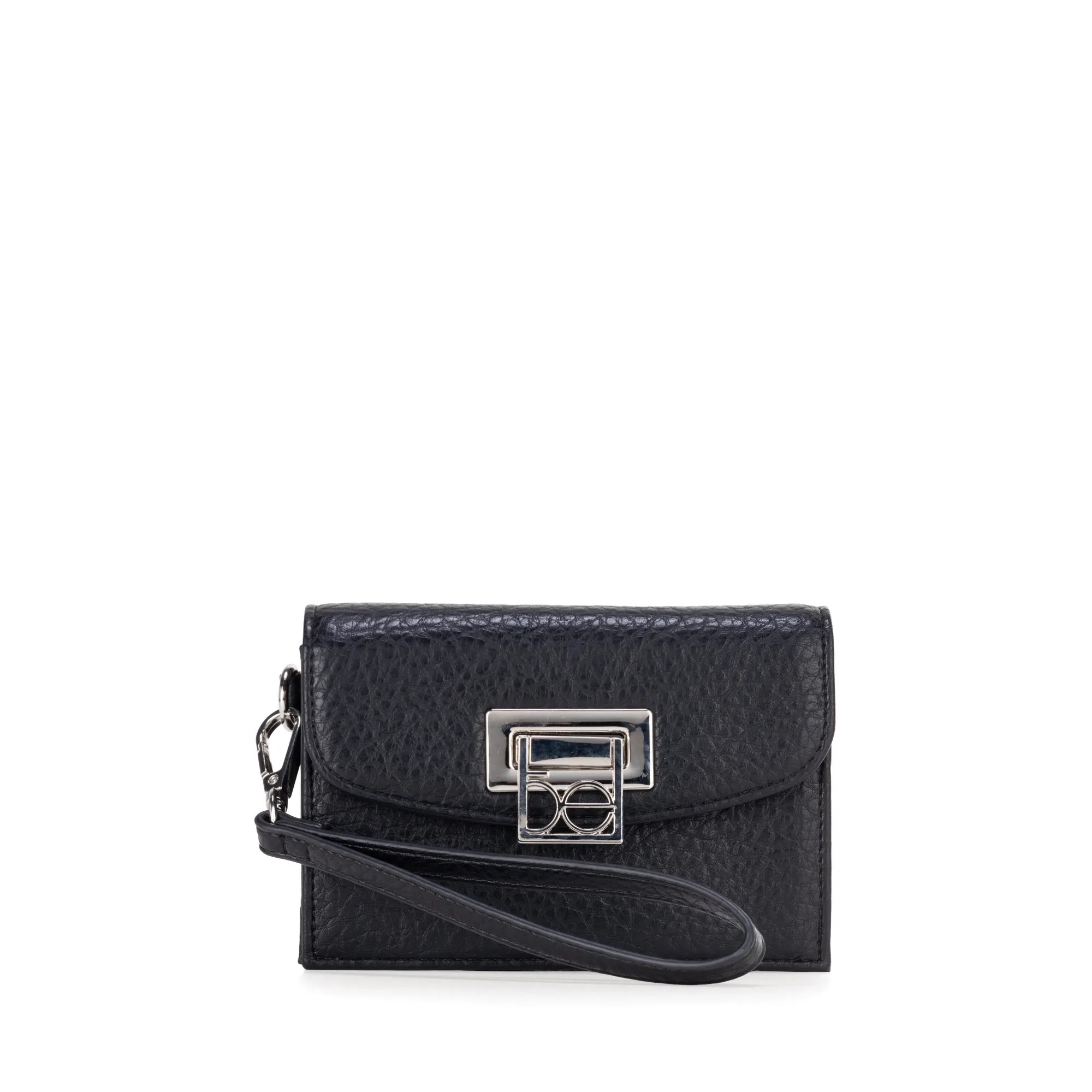 Billetera hecha con material vegano apariencia piel. Cuenta con tapeta con broche de monograma. Maneral lateral desprendible. Monedero interno. Múltiples compartimentos internos.
