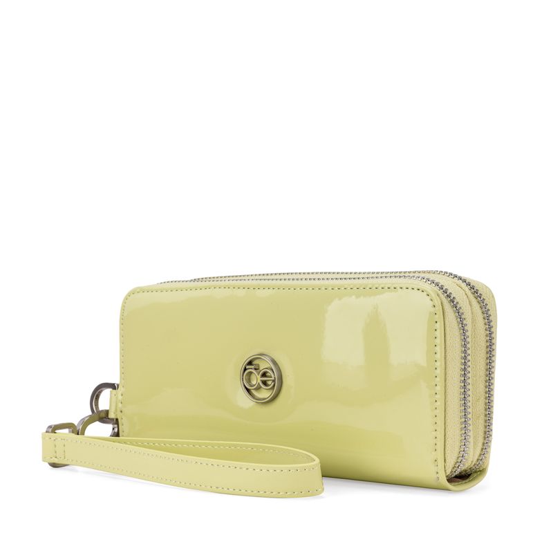 Billetera hecha con material charol. Cuenta con cierre metálico de larga duración. Tiene herraje de monograma. Maneral lateral de fácil uso. Múltiples espacios para billetes y tarjetas.
