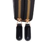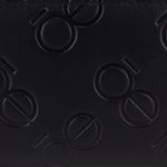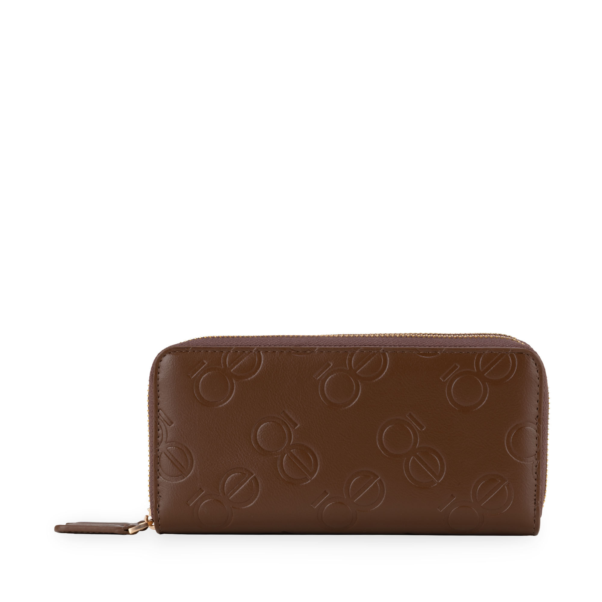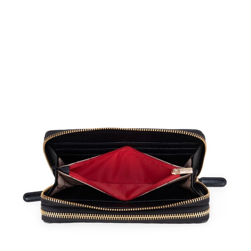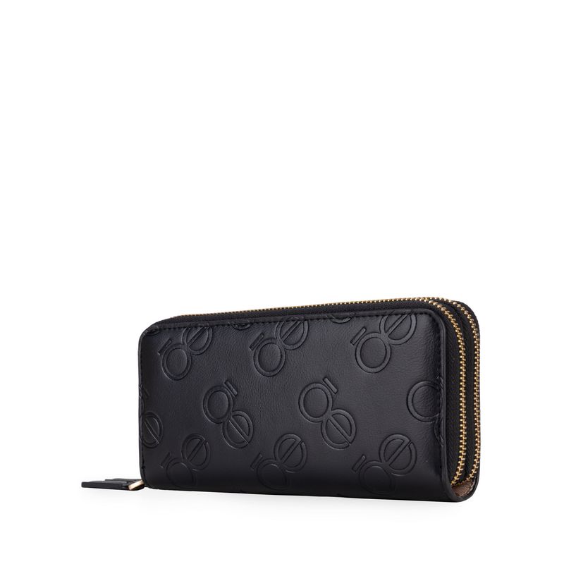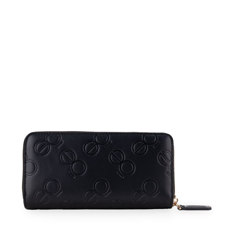 Cartera hecha con material vegano apariencia piel. Cuenta con cierre metálico de larga duración. Diseño de monogramas troquelados. Múltiples compartimentos internos para billetes y tarjetas.