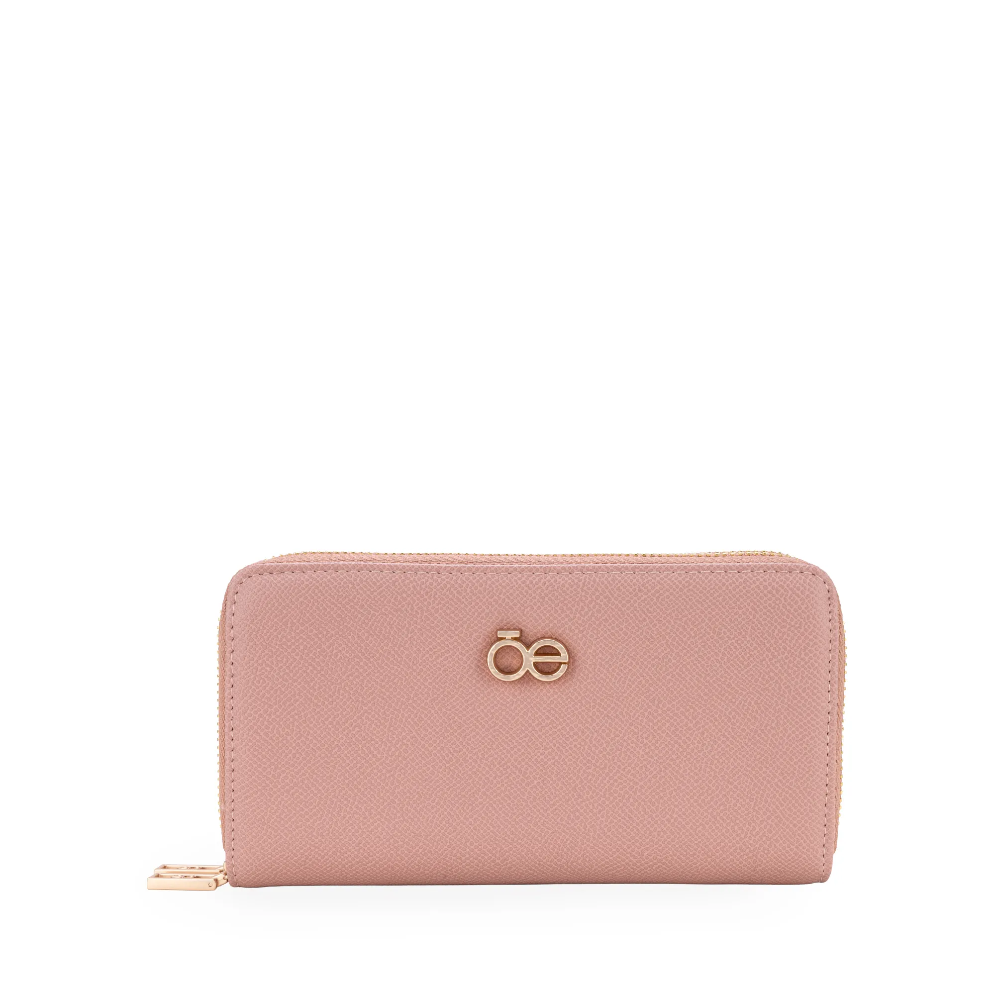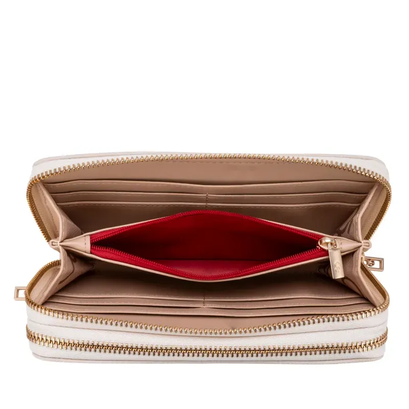Billetera hecha con material vegano apariencia piel. Cuenta con cierre metálico de larga duración. Herraje metálico de monograma. Monedero interno. Múltiples compartimentos internos para tarjetas y billetes.
