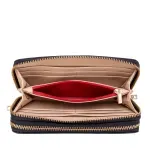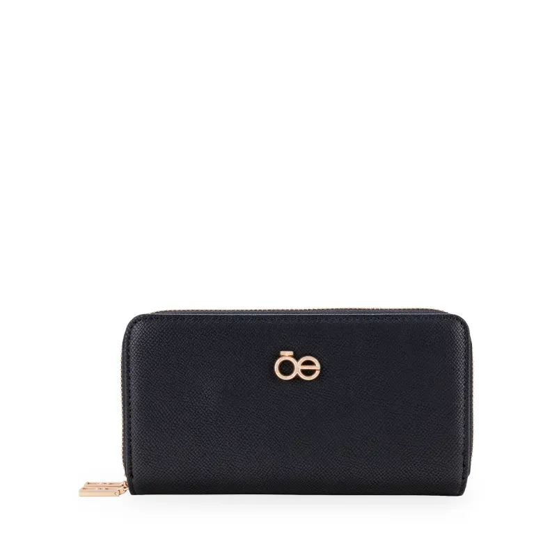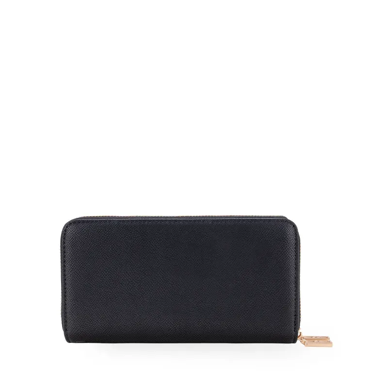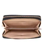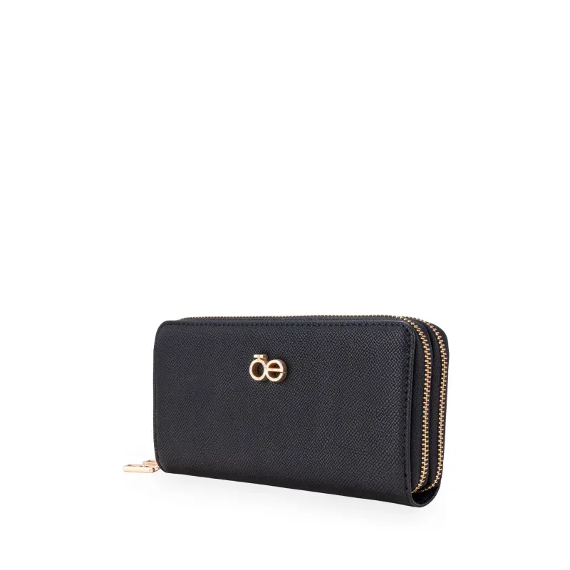 Billetera hecha con material vegano apariencia piel. Cuenta con cierre metálico de larga duración. Herraje metálico de monograma. Monedero interno. Múltiples compartimentos internos para tarjetas y billetes.