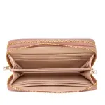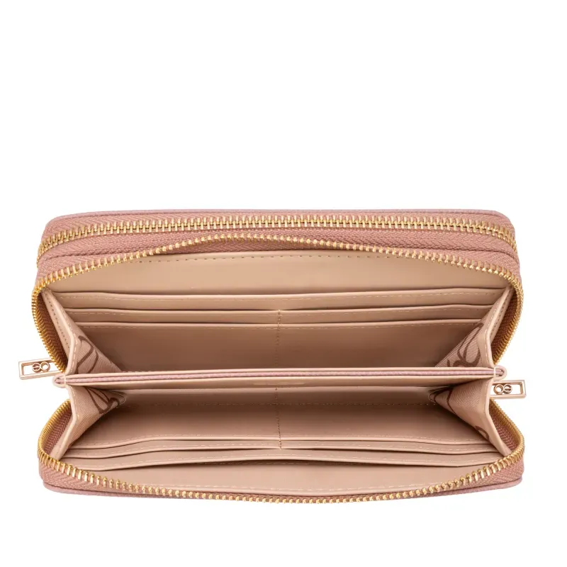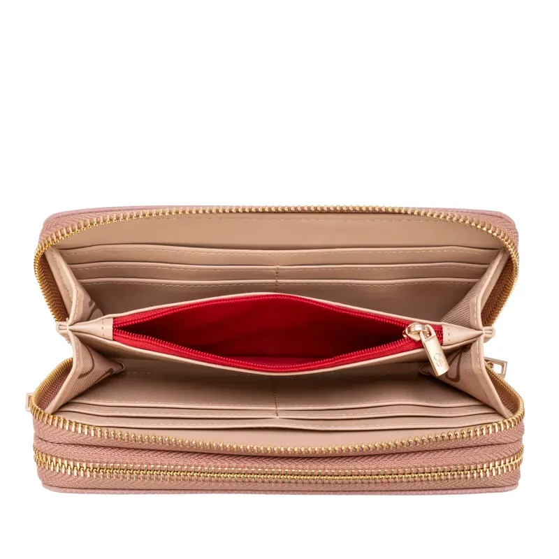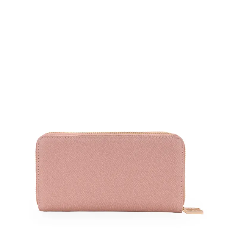 Billetera hecha con material vegano apariencia piel. Cuenta con cierre metálico de larga duración. Herraje metálico de monograma. Monedero interno. Múltiples compartimentos internos para tarjetas y billetes.