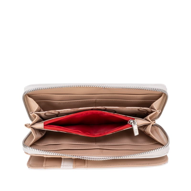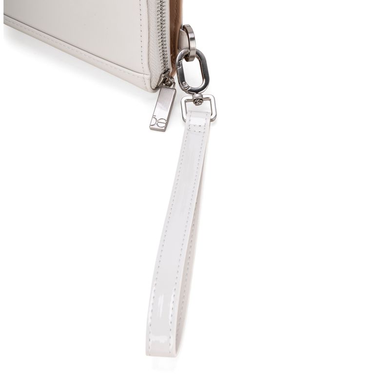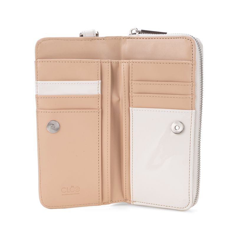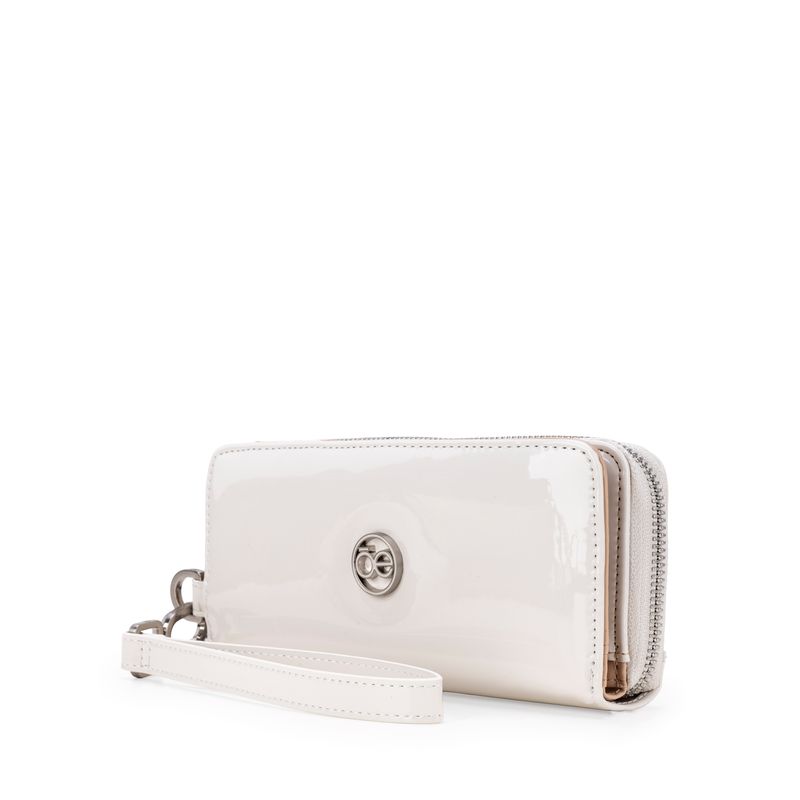 Billetera hecha con material charol. Cuenta con cierre metálico de larga duración. Tiene herraje de monograma. Maneral lateral de fácil uso. Apartado flap con múltiples espacios para tarjetas.