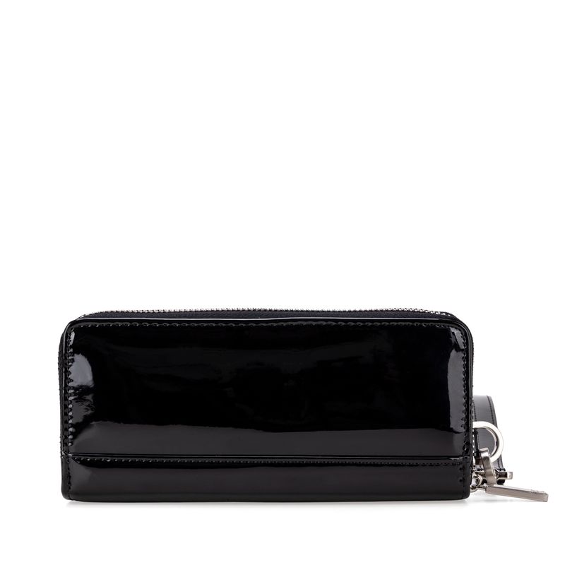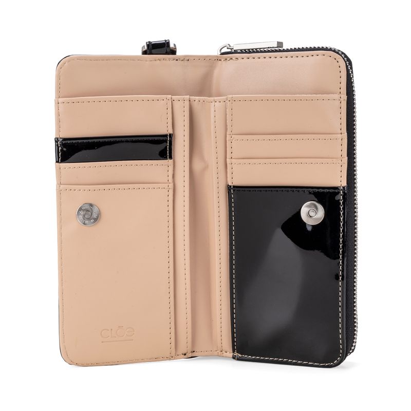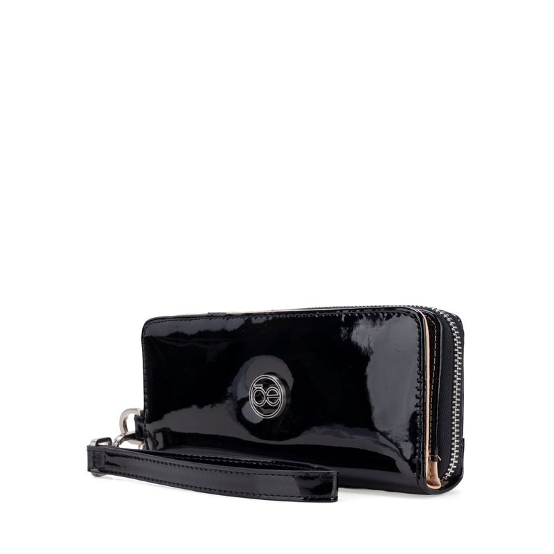 Billetera hecha con material charol. Cuenta con cierre metálico de larga duración. Tiene herraje de monograma. Maneral lateral de fácil uso. Apartado flap con múltiples espacios para tarjetas.