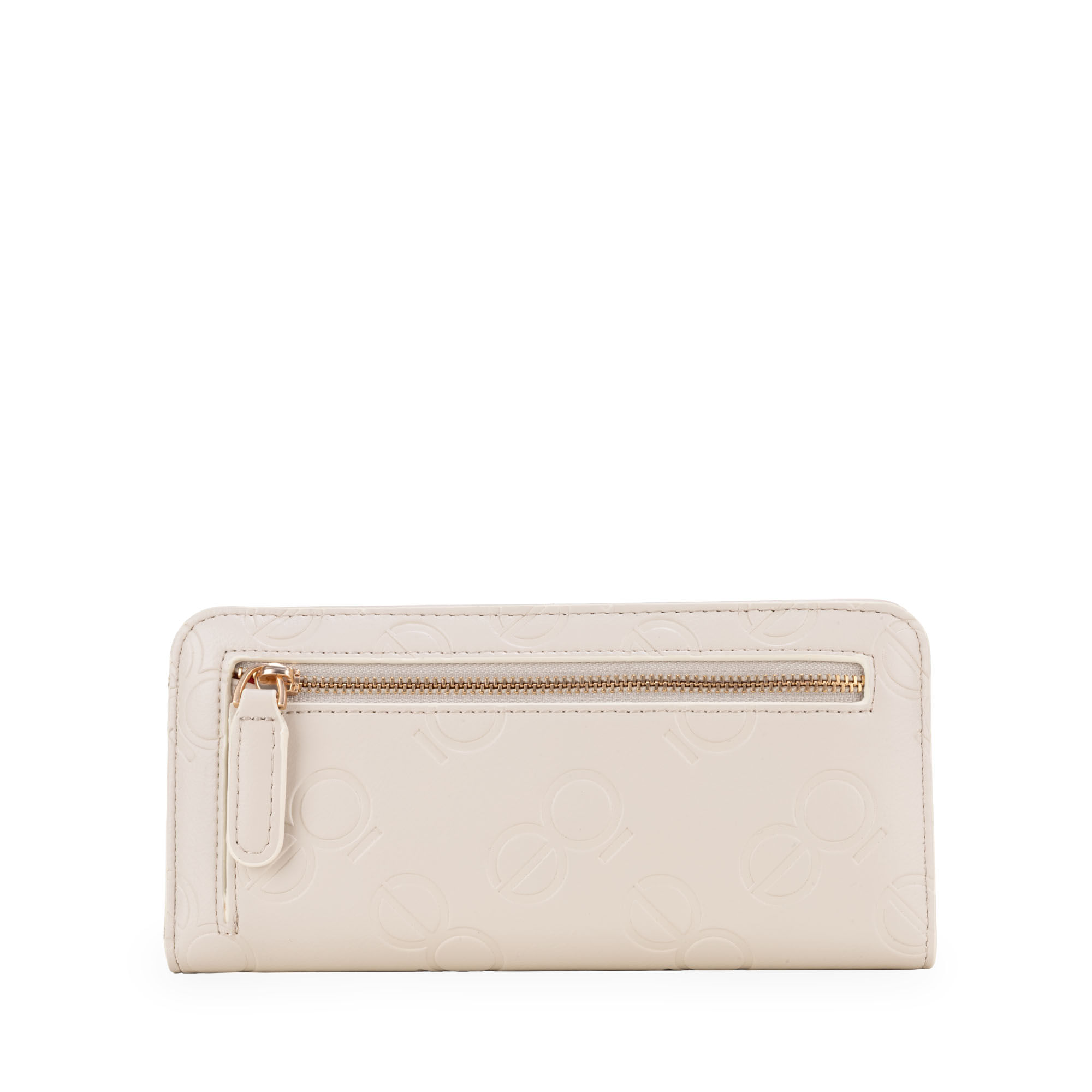 Cartera hecha con material vegano apariencia piel. Cuenta con cierre metálico de larga duración. Diseño de monogramas troquelados. Múltiples compartimentos internos para billetes y tarjetas.