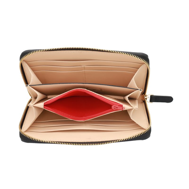 Billetera hecha con material vegano apariencia piel. Cuenta con cierre metálico de larga duración. Tiene rubber de monograma al tono. Múltiples compartimentos internos para billetes y tarjetas.