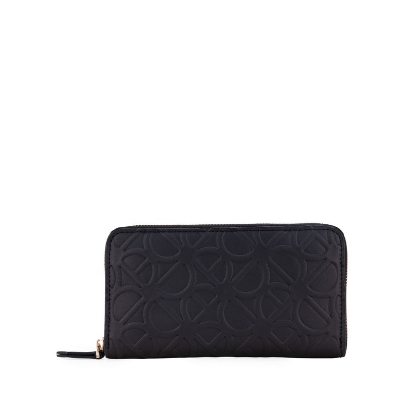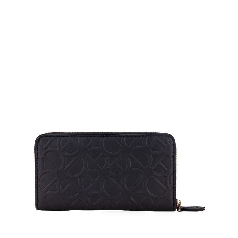 Billletera hecha de material vegano apariencia piel. Cuenta con Look troquelado de monograma. Cierre metálico de larga duración. Monedero interno. Múltiples compartimentos para tarjetas.