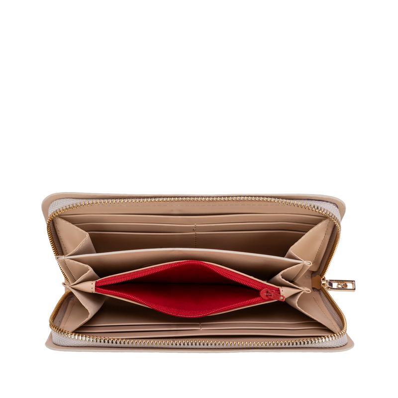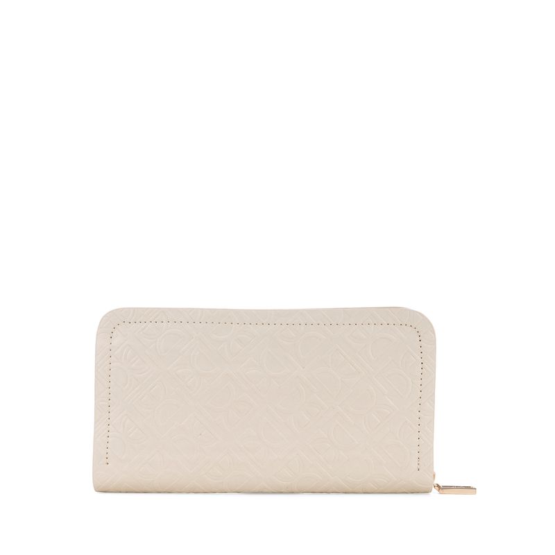 Billetera hecha con material vegano apariencia piel. Cuenta con cierre metálico de larga duración. Look de monograma de alto relieve. Múltiples compartimentos internos para billetes y tarjetas. Monedero interno.