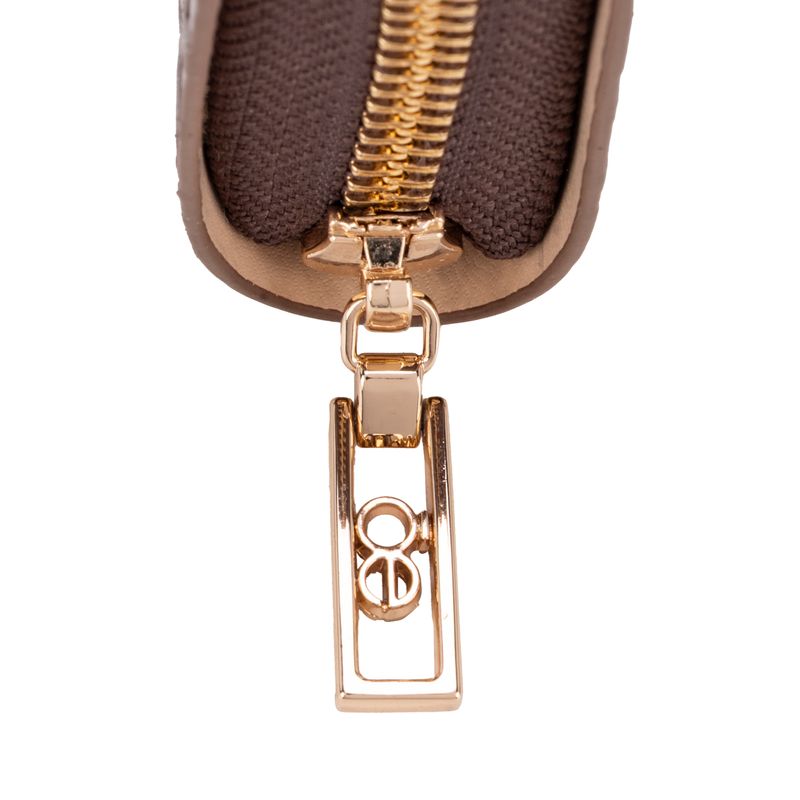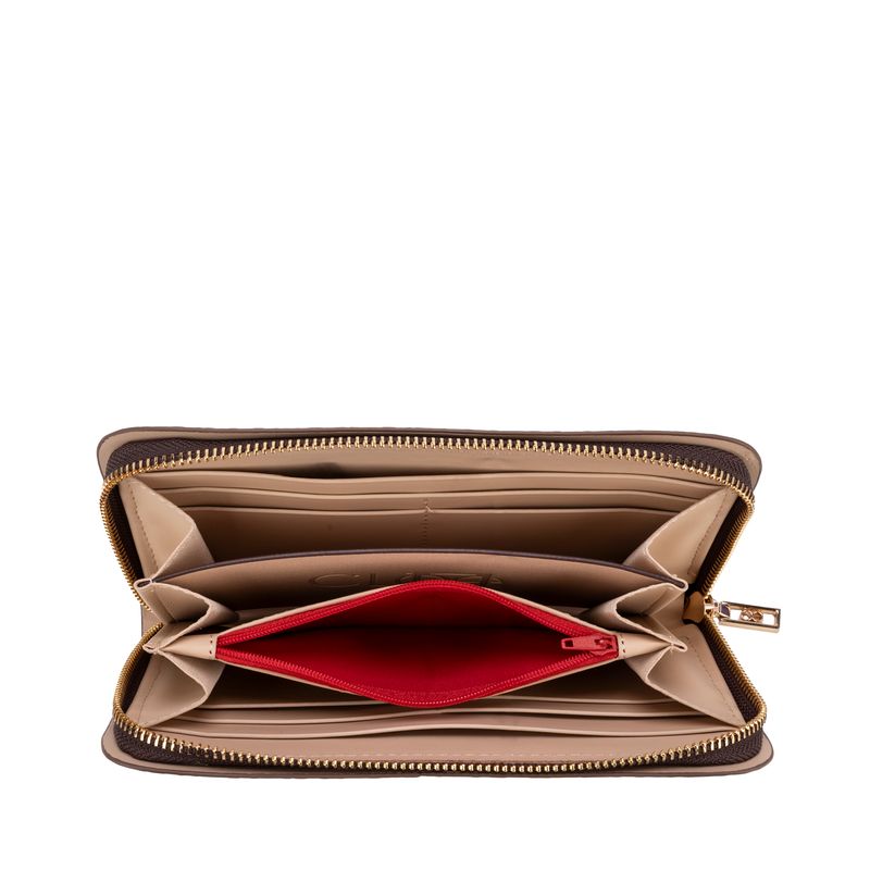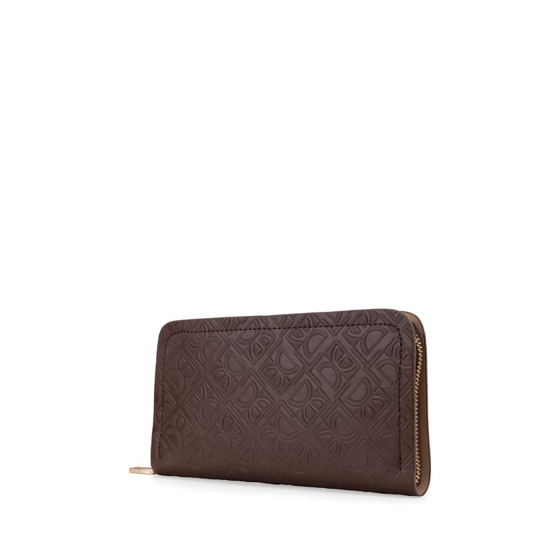 Billetera hecha con material vegano apariencia piel. Cuenta con cierre metálico de larga duración. Look de monograma de alto relieve. Múltiples compartimentos internos para billetes y tarjetas. Monedero interno.