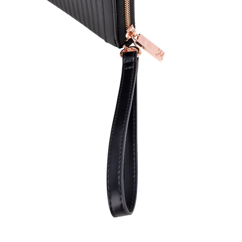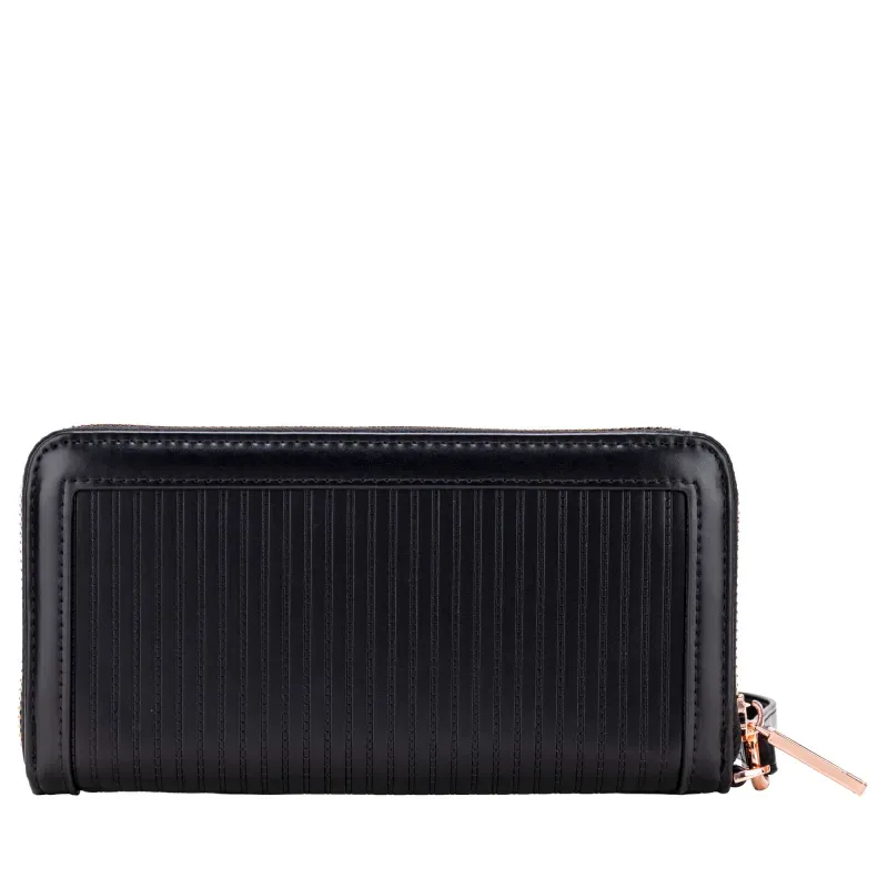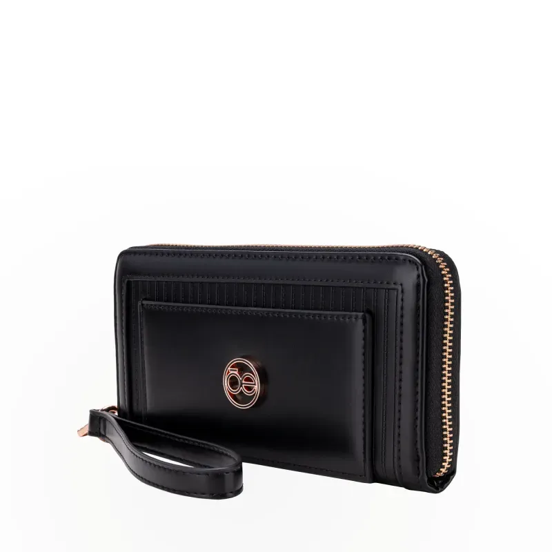 Billetera Cierre Sencillo hecha de material vegano. Cuenta con maneral de fácil uso desprendible. Múltiples compartimentos internos para tarjetas y billetes. Cierre metálico de larga duración. Tiene herraje metálico de monograma.