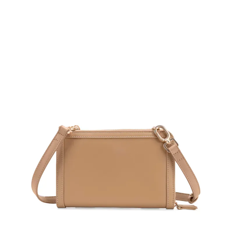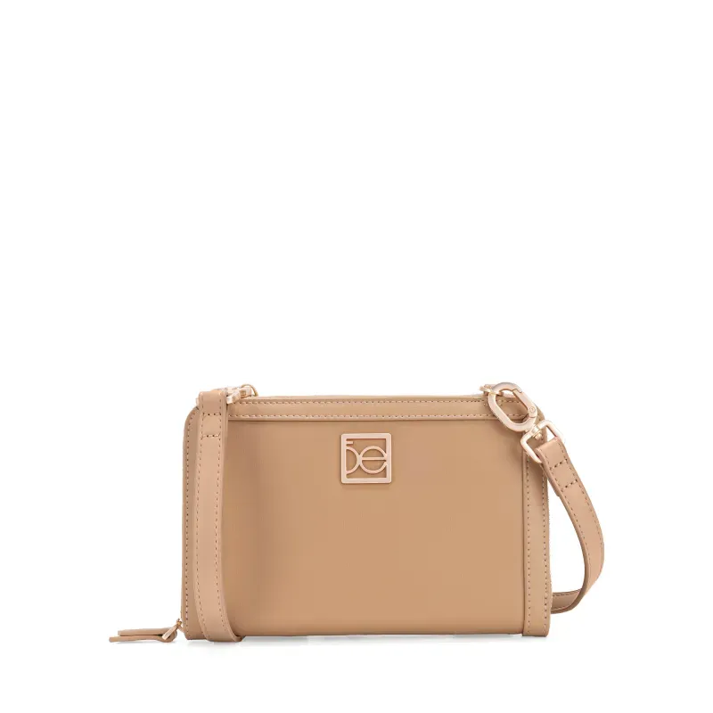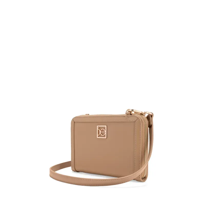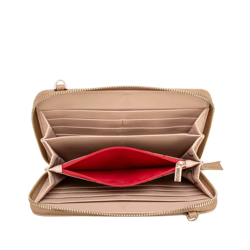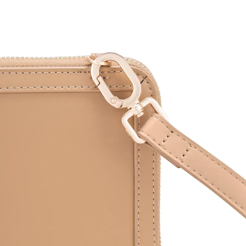 Billetera hecha con material vegano apariencia piel. Cuenta con cierre metálico de larga duración. Incluye asa larga ajustable y removible. Tiene herraje de monograma. Asa larga ajustable y removible.