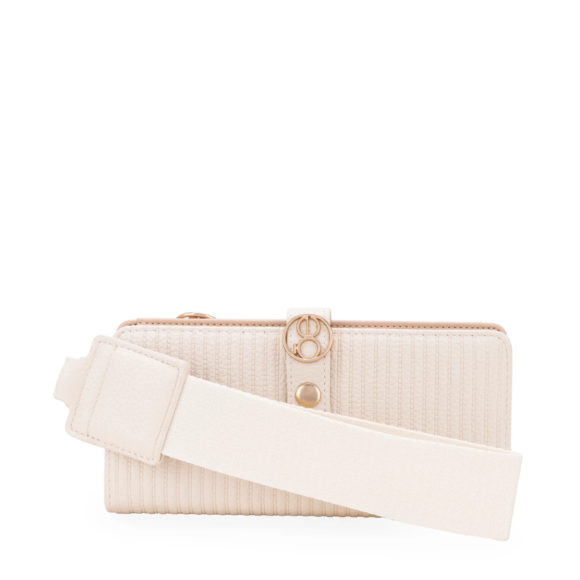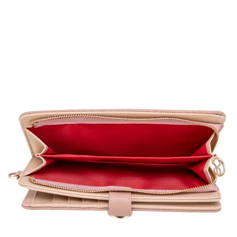 Billetera hecha con material vegano apariencia piel. Cuenta con cerradura por borche de presión. Tiene Herraje metálico de monograma. Incluye maneral lateral de fácil uso. Múltiples compartimentos para tarjetas. Compartimento con cierre metálico para monedas.