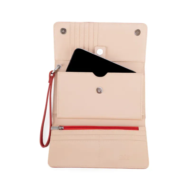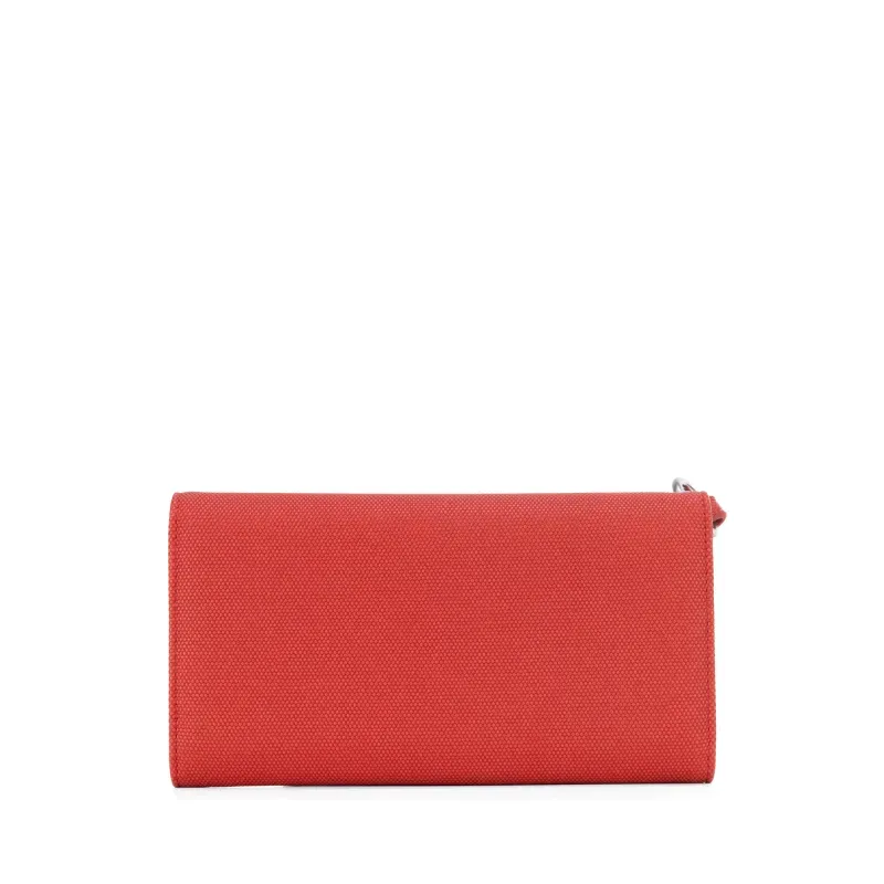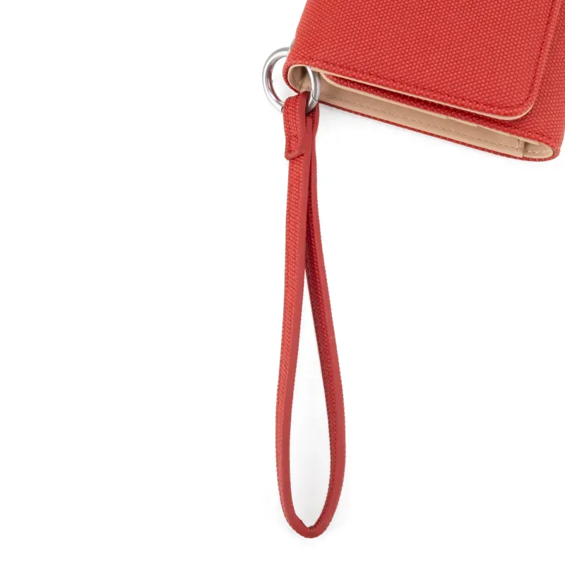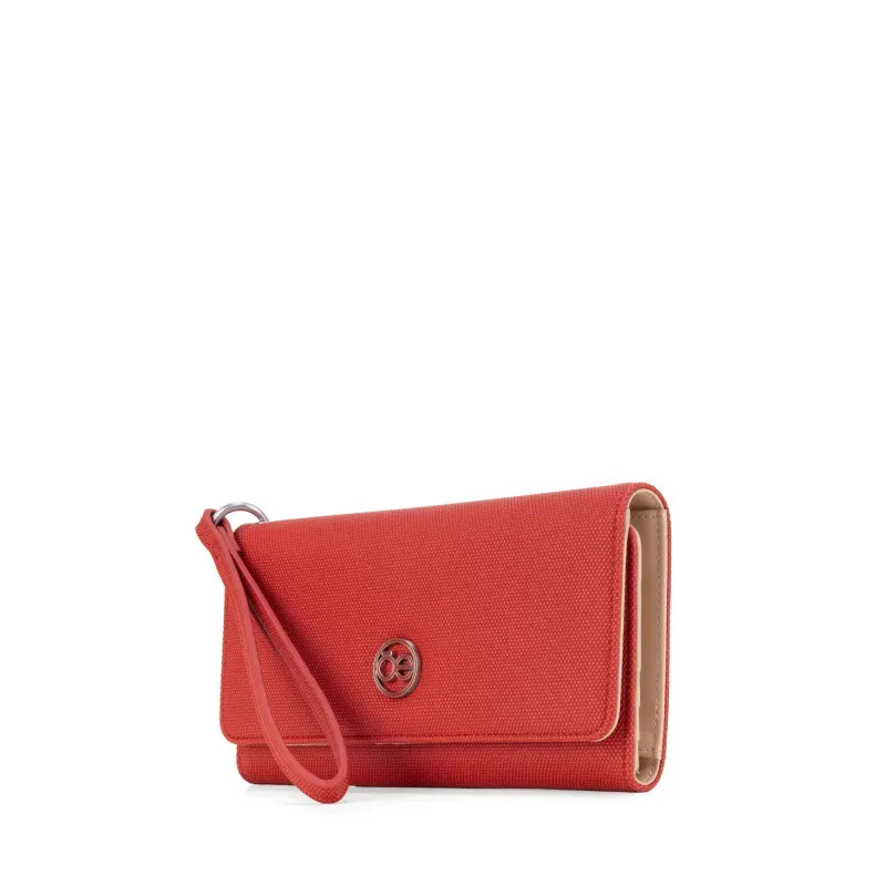 Billetera Flap hecha con material vegano apariencia textil. Cuenta con maneral de fácil uso desprendible. Tiene herraje metálico de larga duración. Múltiples compartimientos internos para billetes y tarjetas.