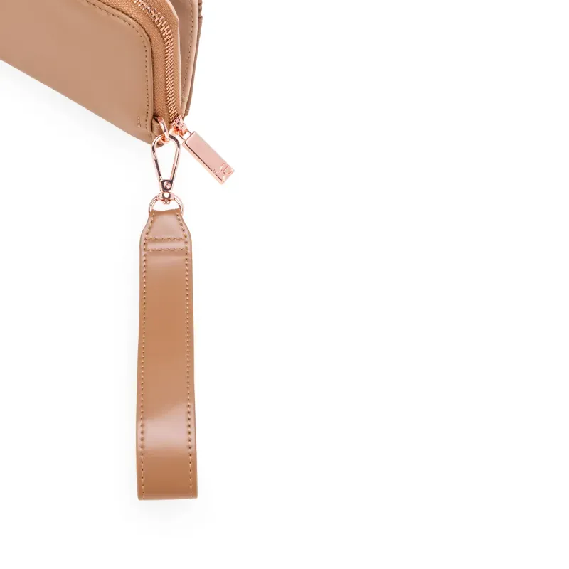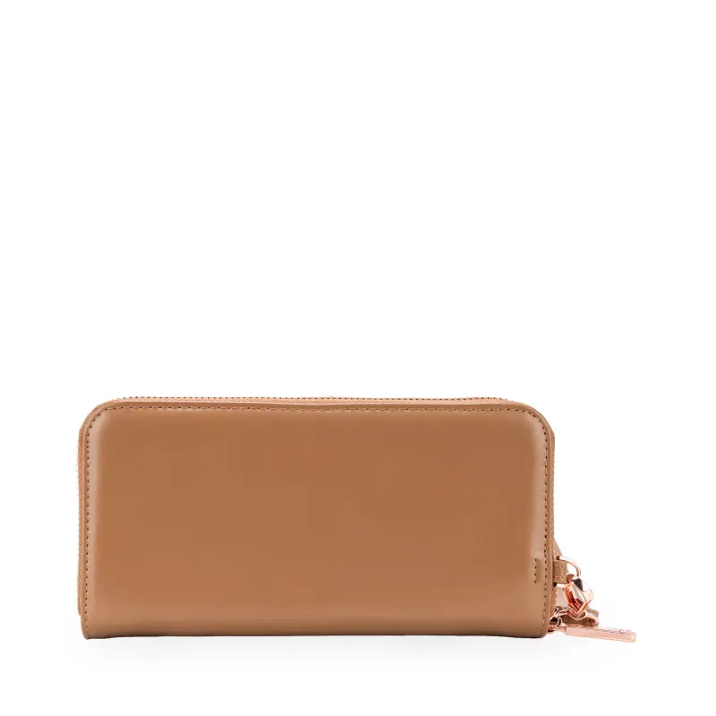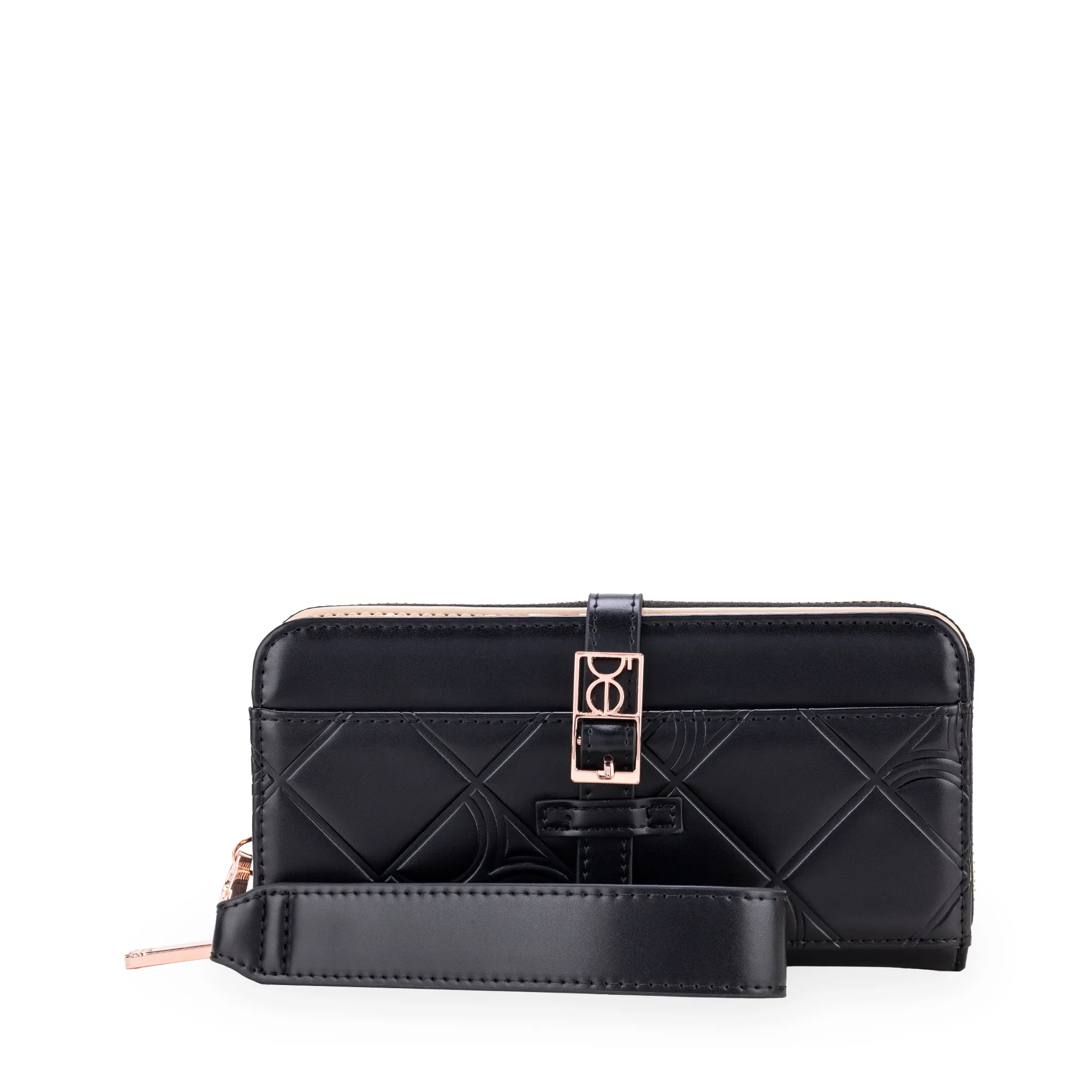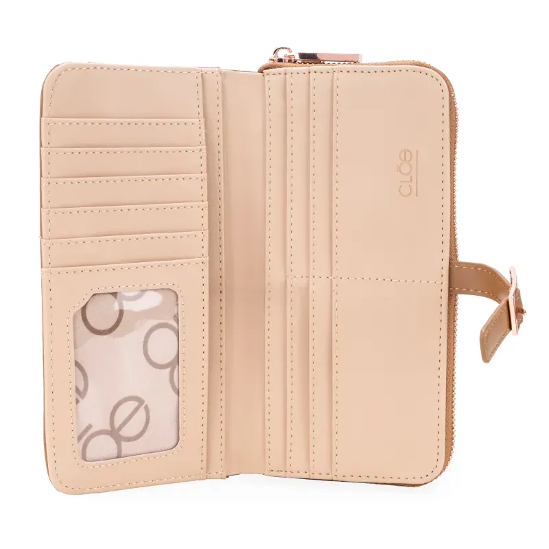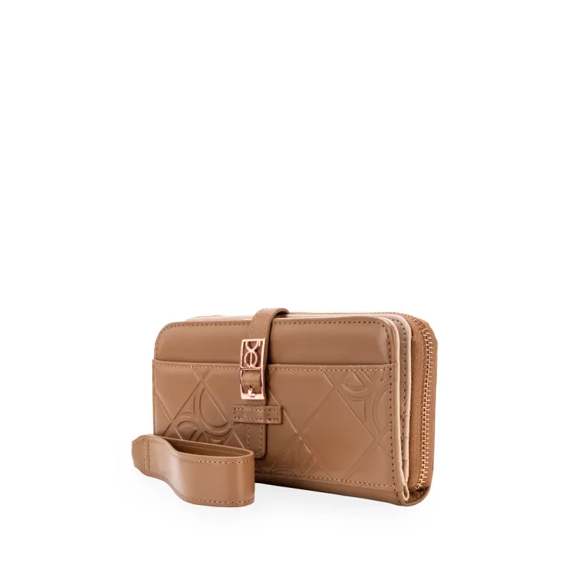 Billetera hecha de material vegano. Cuenta con maneral de fácil uso desprendible. Múltiples compartimientos internos. Tiene hebilla de metal con monograma.